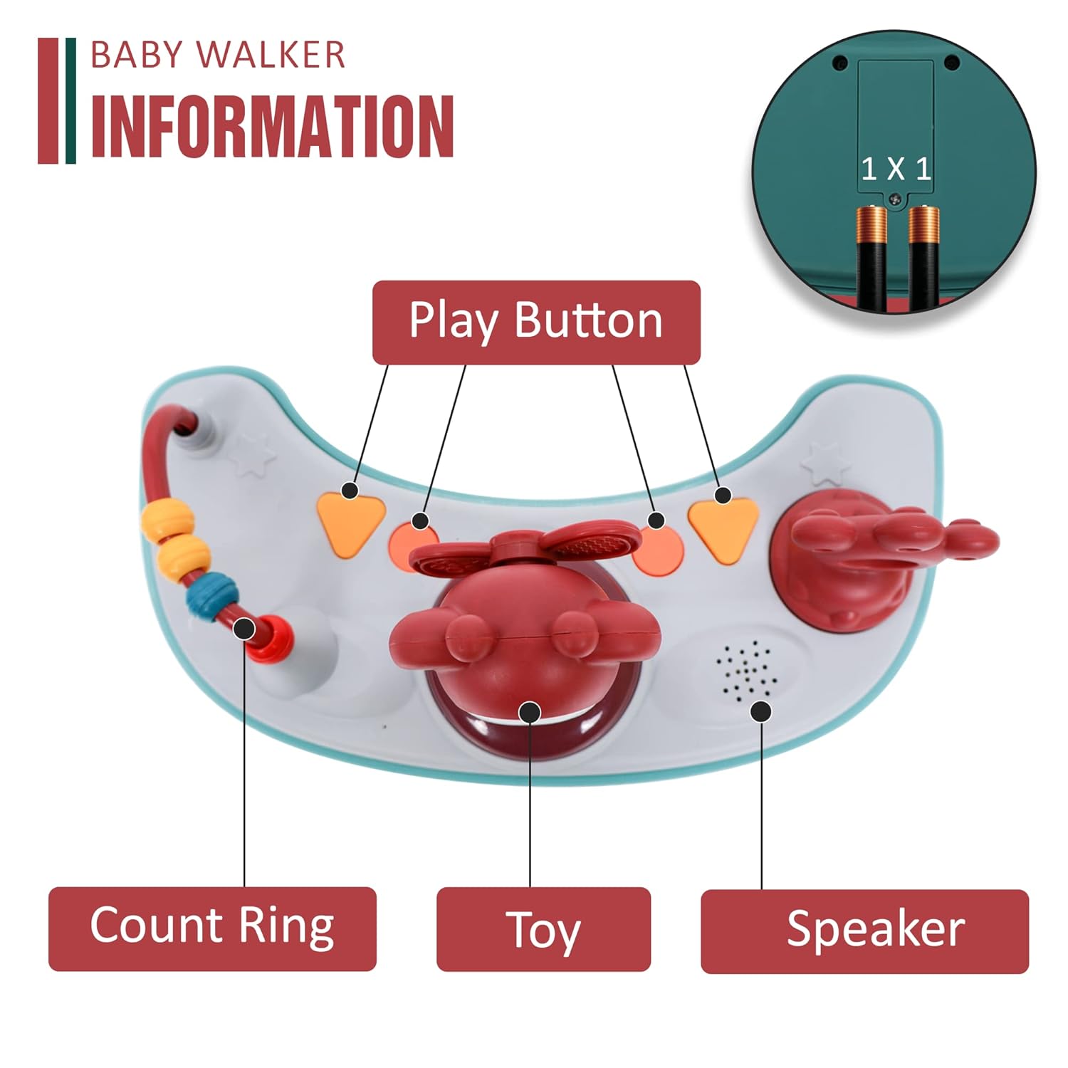 Introduce your little one to their first steps in style and comfort with the Volly Adjustable Baby Walker, designed for babies aged 6 to 18 months. With a sturdy, wide base for stability and a playful red-and-white color scheme, this walker combines fun with safety to encourage mobility development. The plush seat with whimsical cartoon prints ensures comfort, while interactive toys keep your baby entertained and stimulated.