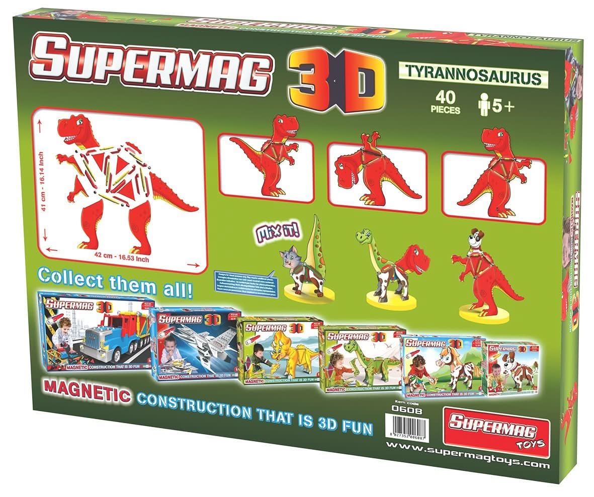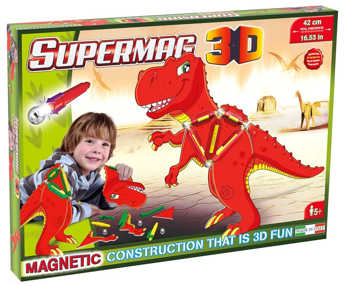 The Supermag 3D line of magnetic constructions will provide an opportunity to construct a three-dimensional object - a dinosaur,With its magnetic rods and balls and colourful inserts, children can experience flexibility and simplicity of building a castle, all in total safety.