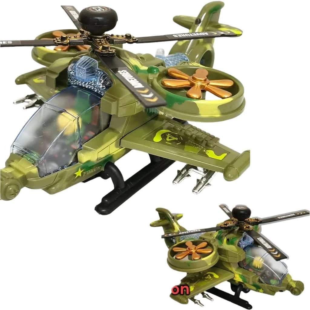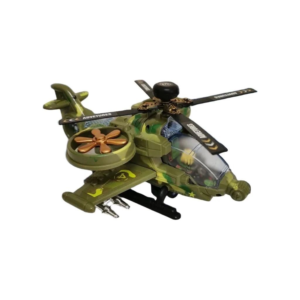 Military helicopter with sound and light is a toy helicopter with 2 large propellers in circles on the sides and one propeller on top. The toy itself moves forward/backward on wheels (on the floor), pushes off and turns when an obstacle is encountered. It makes the noise of helicopter blades and sounds of shooting. Rich LED lighting in different places: a spotlight on the nose, a light in the cockpit, a light in the tail. It is activated by a button (it works on 3 AA batteries - not included). The toy is made of plastic, painted camouflage, green.