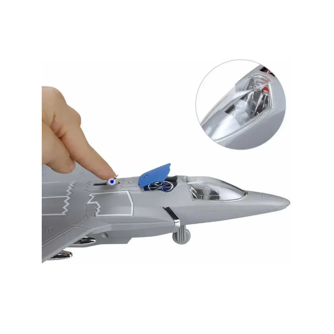- LIGHTS AND SOUNDS: For a more enjoyable play experience the fighter jet is equipped with front and back LED lights and sound effects. Simply press the button located on the top of the fighter jet for the front and back lights to flash while action sounds begin to play. The top roof behind the cockpit will also open once the button is pressed