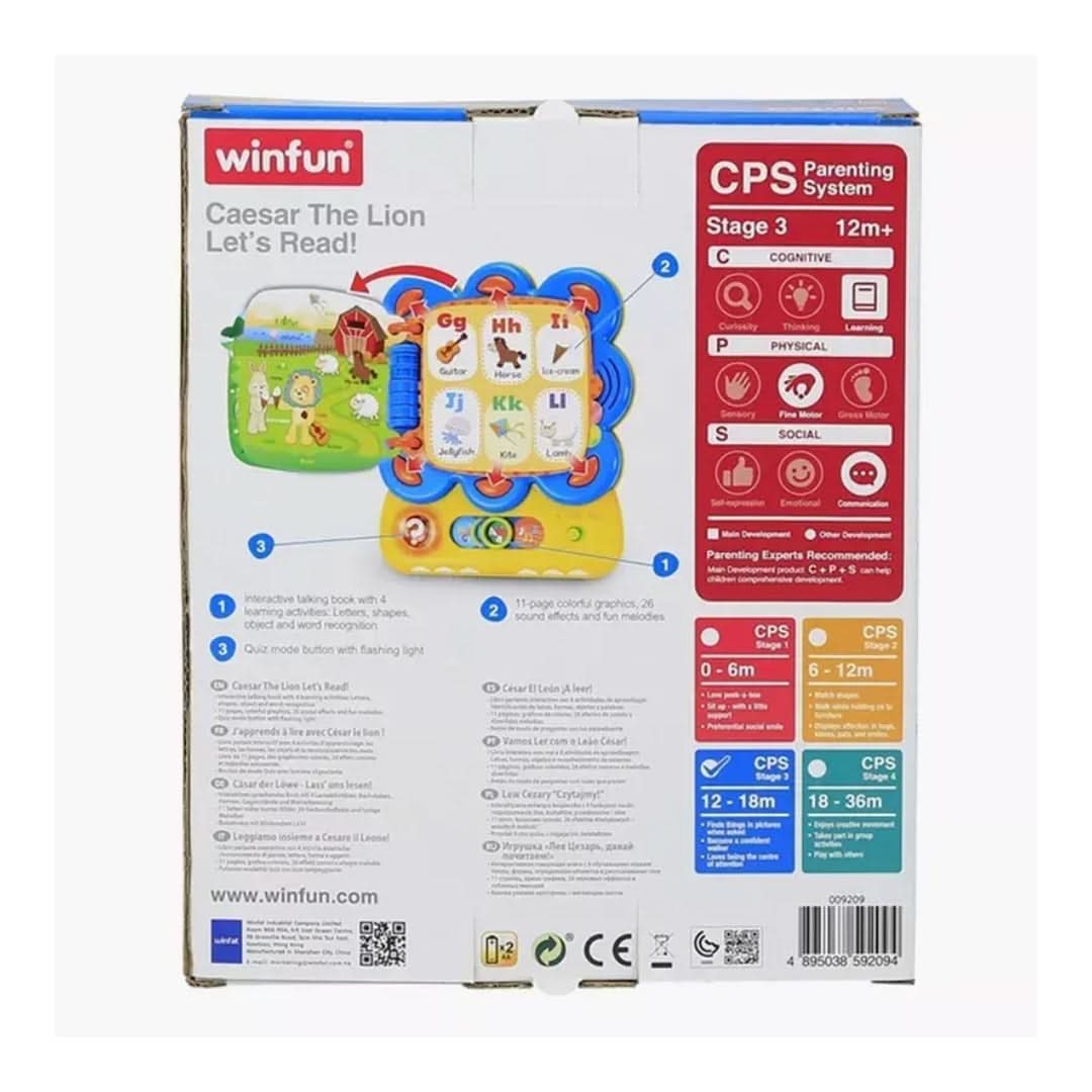 WINFUN: LETS READ! CAESAR THE LION – The perfect companion for your child's literacy journey! This interactive talking and reading adventure book, led by the adorable Caesar the Lion, brings the magical realm of learning to vivid life. Through four captivating activities centered on letters, shapes, objects, and word recognition, this toy becomes an indispensable aid for boosting comprehension and cognitive skills in young learners. With eleven vibrant and easily attachable graphics, along with twenty-six charming sound effects and melodies, every turn of the page becomes an immersive sensory experience for your child. The inclusion of a quiz mode button, accompanied by flashing lights, injects an extra layer of excitement into the learning process, ensuring that education becomes not just informative, but also entertaining and rewarding. Let Caesar the Lion join your child through the gateway of exploration and discovery. This book will be a catalyst for igniting a lifelong passion for learning, curiosity, and creativity in a fun and interactive way. CPS PARENTING RATING: STAGE 3 - 12+ Months+