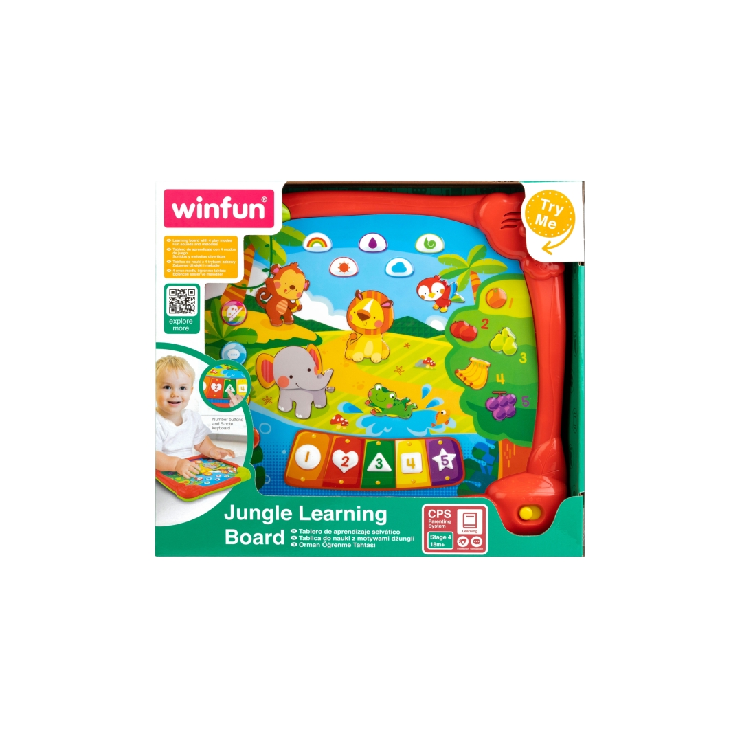 Jungle friends learning board 4 modes of play: colours, objects and sound effects, music, and question time Number buttons and 5-note keyboard Learn to count with different fruits Animal and weather sound effects Bright and colourful design with easy-press buttons Fun sounds and melodies 2 "AA" batteries included