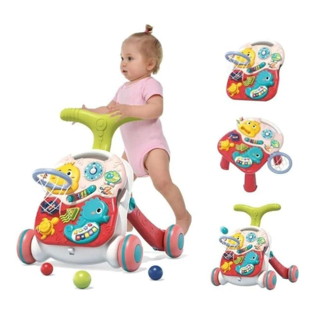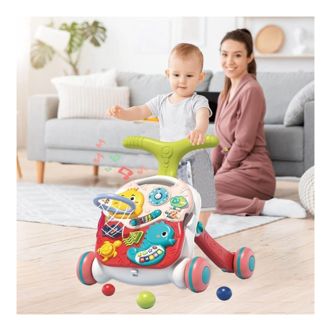 Baby walker toys for sitting and standing: our baby walker toy can develop coordination and strength in toddlers by pushing the walker forward. Its 3-in-1 design easily converts from a removable activity board to a walker or hangs somewhere to keep them busy at every stage. Early Learning Activity Center Detachable and removable activity board comes with shape recognition block, fun electronic device (removable), rattle and detachable basketball frame. Very helpful in developing your child's fine motor skills and hand-eye coordination ability. Starts and helps improve color recognition and shape identification ability during play. SPEED CONTROL The toddler walker push toy is covered with a non-slip shock-absorbing soft rubber ring, which can increase friction with the ground and change the acceleration ability. And the rear wheel can be adjusted at different speeds to meet the needs of children in different walking stages. Includes triangular table structures to make your child's steps safe. The scientific ergonomic design allows baby to learn the correct and safe way to walk while helping them support their sensitive knees. Designed for Babies The handle of the walker can be adjusted according to the height of Also, this activity walker can increase weight by filling some water, sand or other heavy objects into the water tank and hollow back legs. You can customize the weight of the walker according to your baby's strength, making your baby walk more smoothly and safely. Safe & Durable Material This baby walker is made of safe and non-toxic ABS material with smooth edges. Early educational baby push toy is a great gift for birthday and newborn. Perfect birthday gift choice for babies and toddlers, both girls and boys.