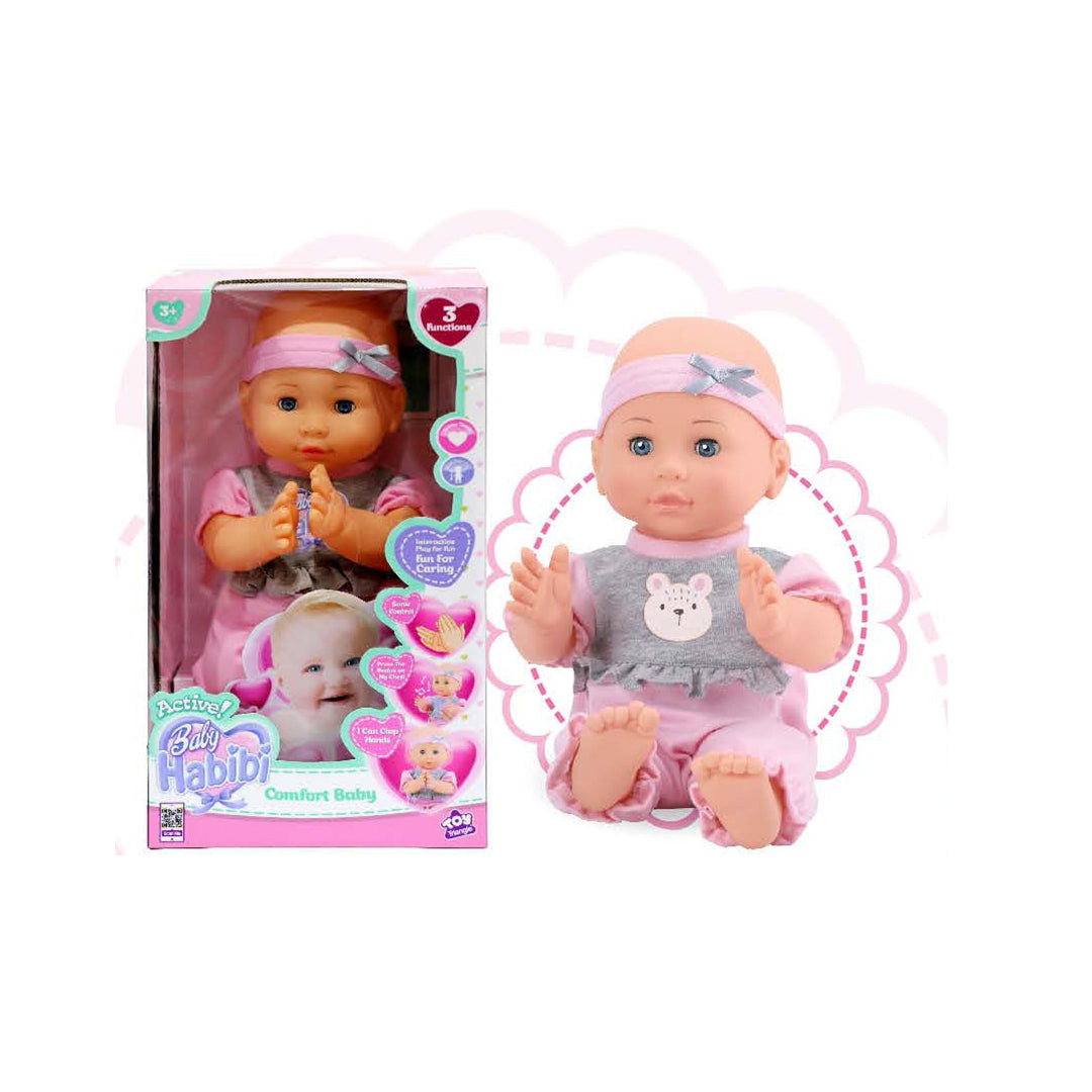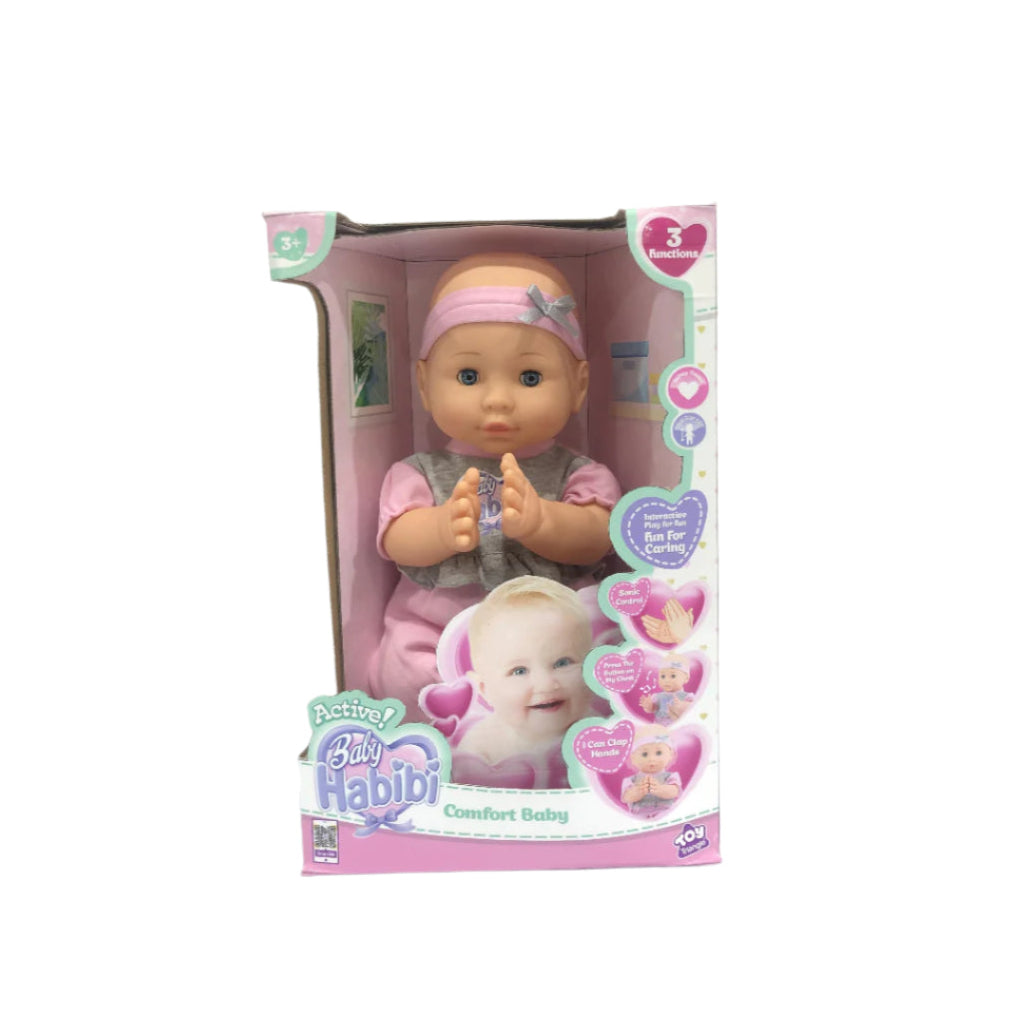 The Baby Habibi Clap Hands Doll 14 inch (Model BH-697928) is an engaging interactive toy designed to encourage nurturing and imaginative play among young children. Crafted from soft vinyl material, this charming doll is safe, durable, and pleasant to touch. One of its key features is its ability to clap hands in response to sound, making it more lifelike and entertaining for kids. The doll plays cheerful music and soothing sleeping sounds, providing both playful moments and calming effects during quieter times. Operated with 3 AA batteries, the Baby Habibi Clap Hands Doll is easy to use and ideal for children aged three years and above. Whether for everyday play or a special gift, this doll promises to bring hours of joy, helping little ones develop social skills and emotional bonding through interactive fun.