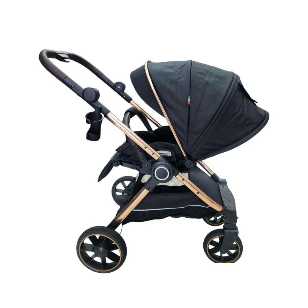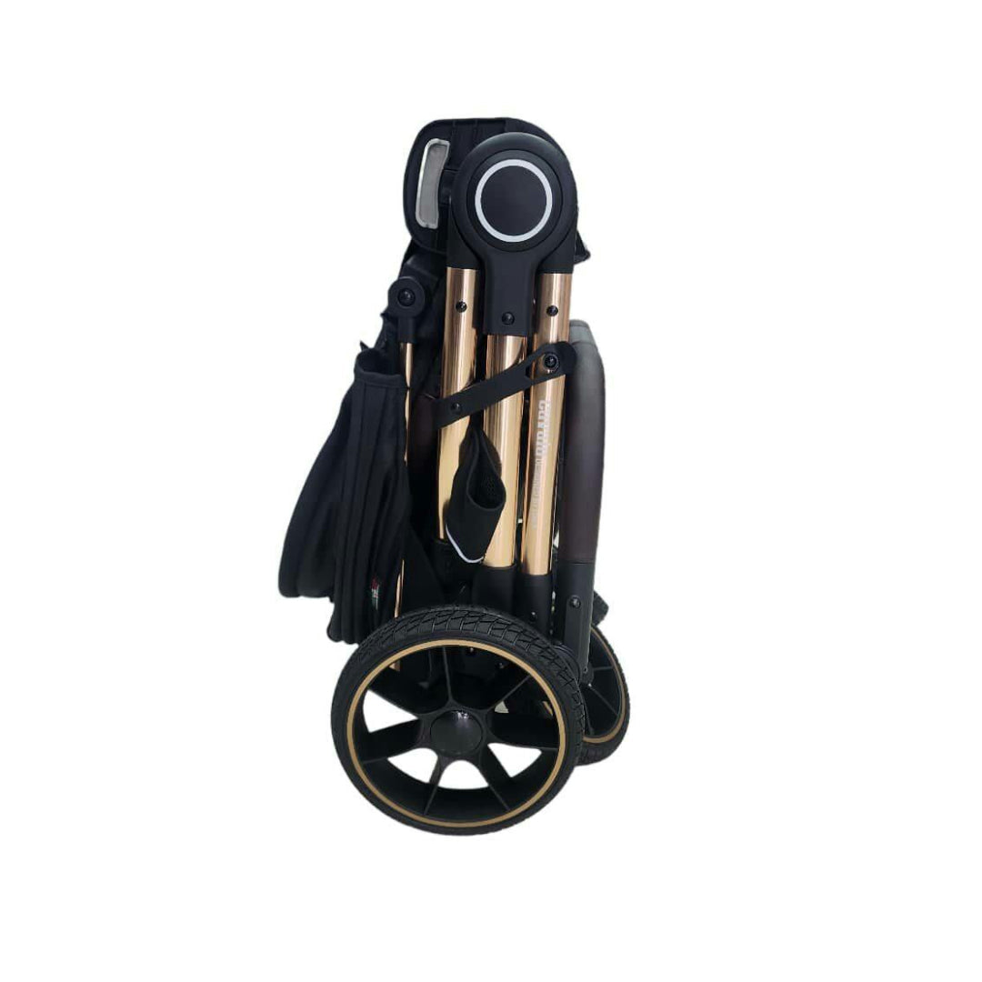 This stroller from ToyLand combines style and advanced functionality to provide maximum comfort for both baby and parents. The stroller comes in a modern design with a sturdy metal frame in a shiny rose gold color, adding a touch of luxury. The top is equipped with a stylish black cover that protects the baby from the sun and weather elements.
