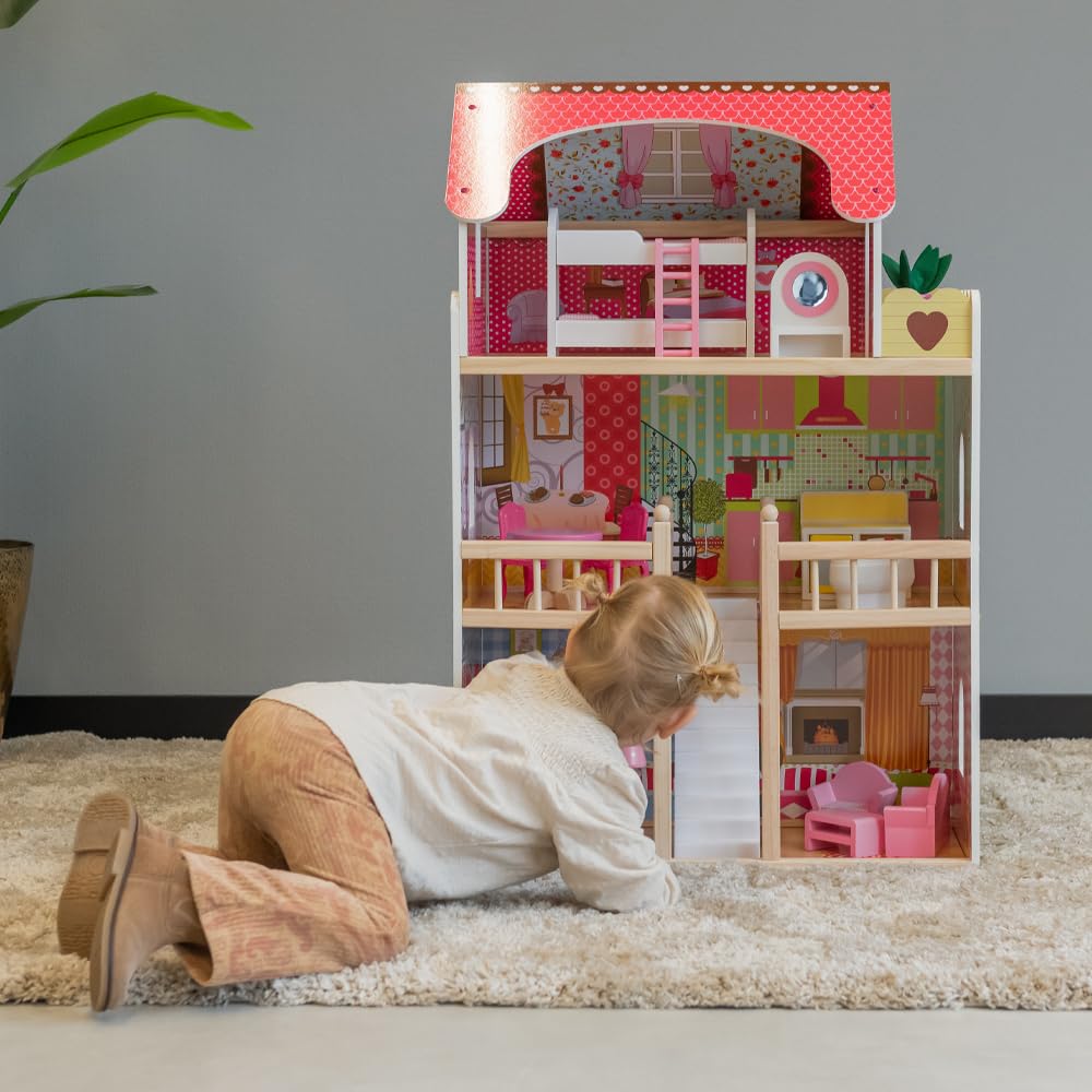 Introducing the Doll House Set! This beautifully furnished dollhouse is the perfect addition to your child's playtime. Not only does it provide endless hours of imaginative play, but it also enhances hand-eye coordination and stimulates their creativity. Watch as your little one immerses themselves in a world of make-believe, taking on different roles and engaging in exciting adventures. With this dollhouse, learning becomes a thrilling experience filled with drama and fun. Let your child's social competence flourish as they interact with others and develop important life skills.