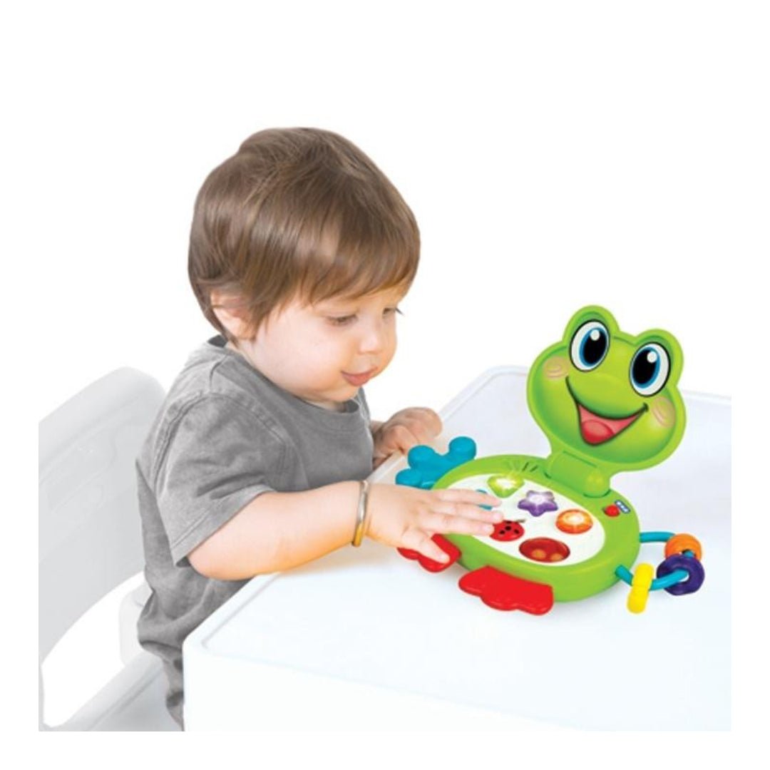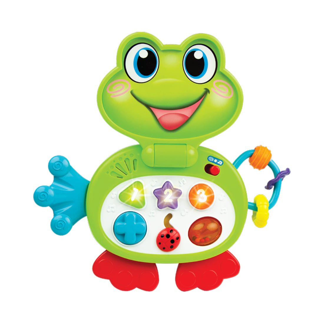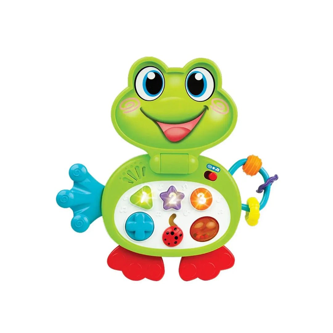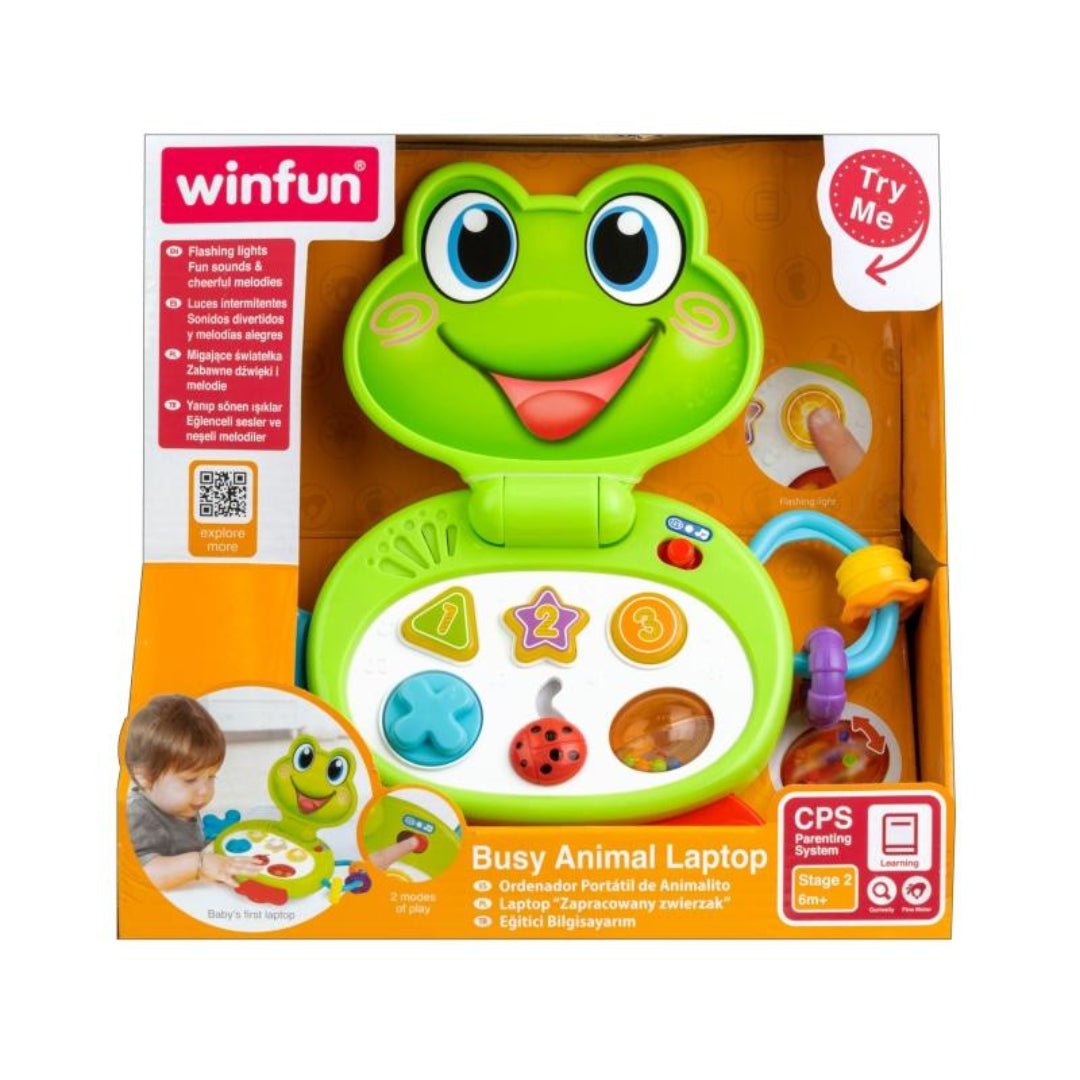 Introducing the Winfun Busy Animal Laptop - Froggy, an interactive and engaging toy designed to captivate your child's imagination and enhance their learning experience. This adorable froggy-themed laptop offers a variety of features that make learning fun and interactive. The laptop includes four learning modes: Alphabet, Animal, Number, and Music, ensuring a comprehensive educational experience. The Alphabet mode introduces your child to letters and phonics, while the Animal mode brings the joy of learning about different animals through fun sounds and animations. In Number mode, children can develop their counting skills, and the Music mode allows them to explore their musical talents by playing various melodies and sounds. The interactive LED screen displays engaging animations that correspond with the selected mode, keeping your child entertained and motivated to learn.