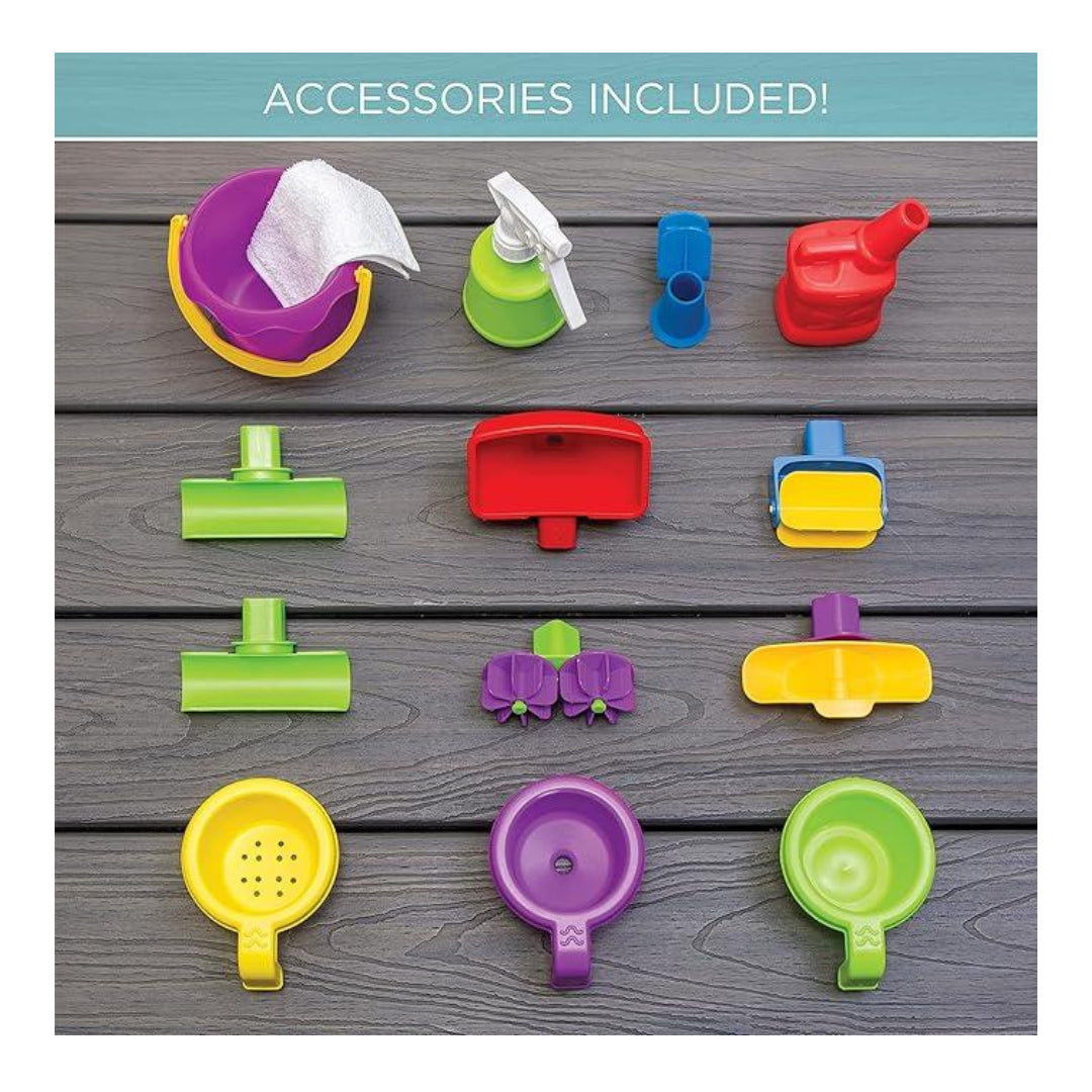 Kids will hear the glug of the water into the “gas tank”, squeak of the windshield wiper, and fall of rain as water pours down the maze, adding extensive sensory exploration to the water activity center play experience.