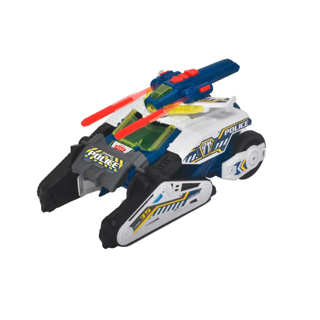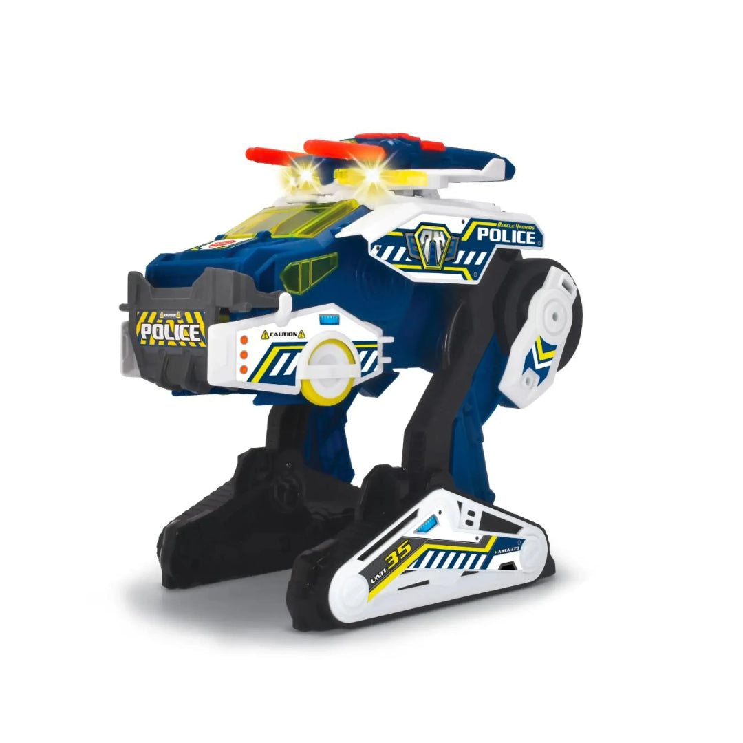 Dickie Toys - Police Bot police vehicle (35 cm) - Futuristic police vehicle (large) with transformer function and other features, toy with light and sound effects, for children aged 3 and above. 2-in-1 police transformer - This feature-packed police vehicle can be transformed into an impressive 28.5 cm tall police robot! Catch the criminals - The front opening of the police bot captures cars and sends them to the built-in prison! Two metal cars are included with the set. A detachable drone on the roof supports the team and fires projectiles towards opponents at the push of a button, accompanied by light and sound effects (batteries are included with the set).