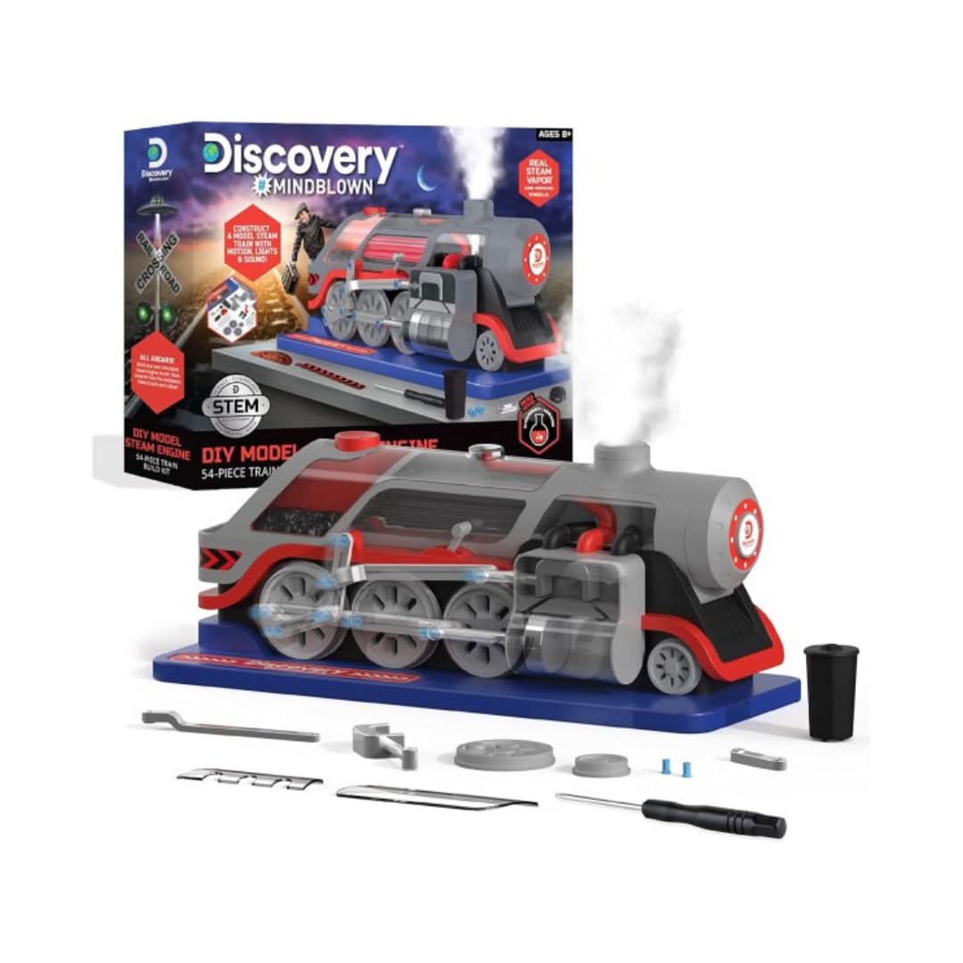 Construct a model steam train with motion, sound, LED lights and LED flashes. Real steam vapour will come out while the motor turns the wheels. Producing a train-like whistle. The lamp tube becomes bright and the atomizer sprays gradually. Please note the wheels only rotate when the steam is coming out.