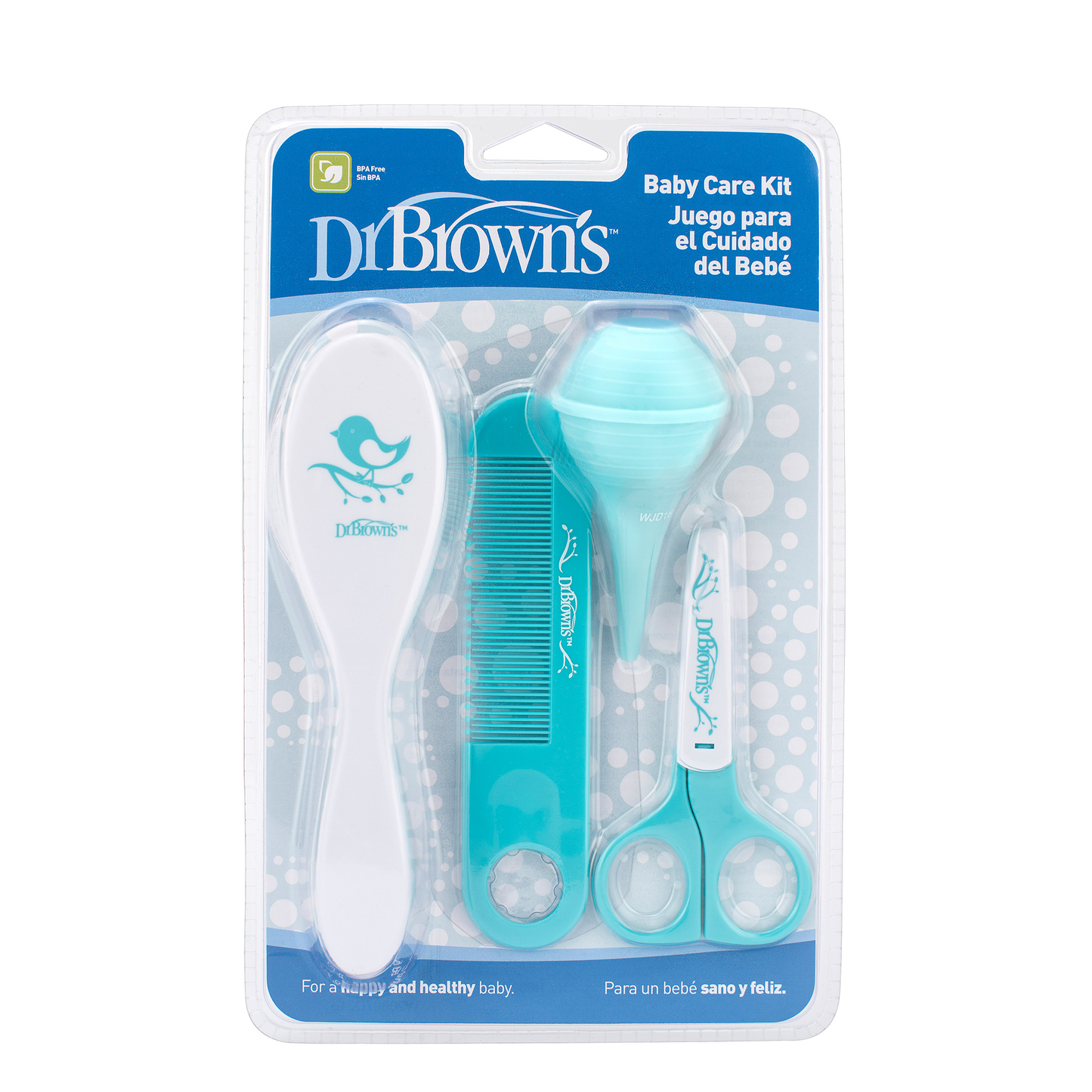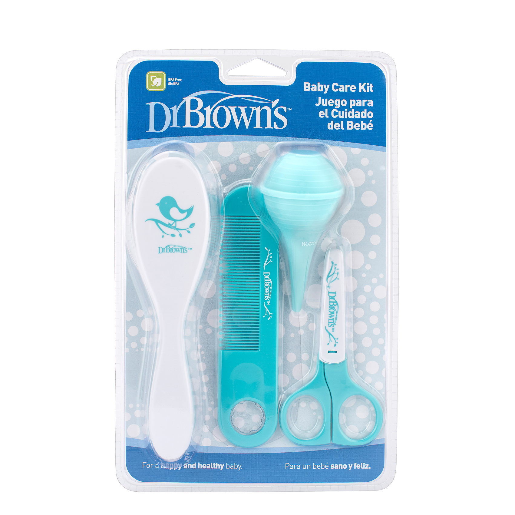 Dr. Brown's Baby Care Kit includes a soft bristle brush and fine comb with rounded tips to prevent scratching baby's scalp. The nasal aspirator clears blockages in baby's nose. Rounded-tip nail scissors have a protective cover for baby's safety.