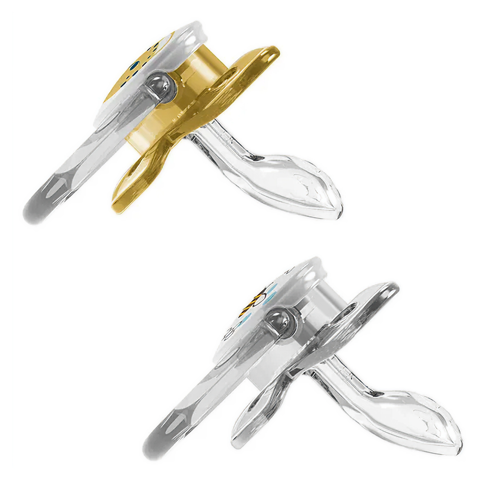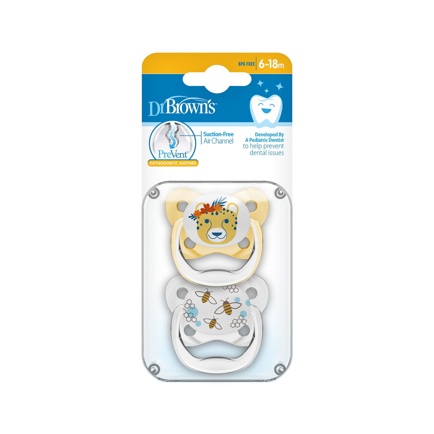 Safe soothing has never been smarter! Dr. Brown's Prevent Pacifiers are as adorable as they are effective. Designed by a paediatric dentist, the 100% silicone bulb features a patented suction-free air channel and thin bulb stem that reduce pressure inside baby's mouth, helping prevent dental issues such as posterior crossbite down the road. Prevent Pacifiers have a size for most ages, ranging from 0m to 18m. The bulb is taste-free, odourless, and keeps its unique shape over time. , , The Contoured Shield curves away from baby's face to reduce the risk of pacifier rash on little cheeks and noses. Prevent Pacifiers are easy to clean and are dishwasher (top rack) and sterilizer safe. Electric sterilization and boiling water only do not sterilize baby pacifiers in the microwave