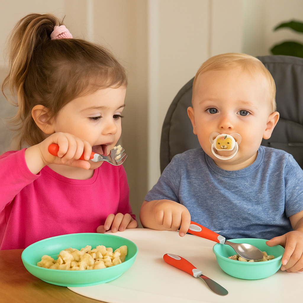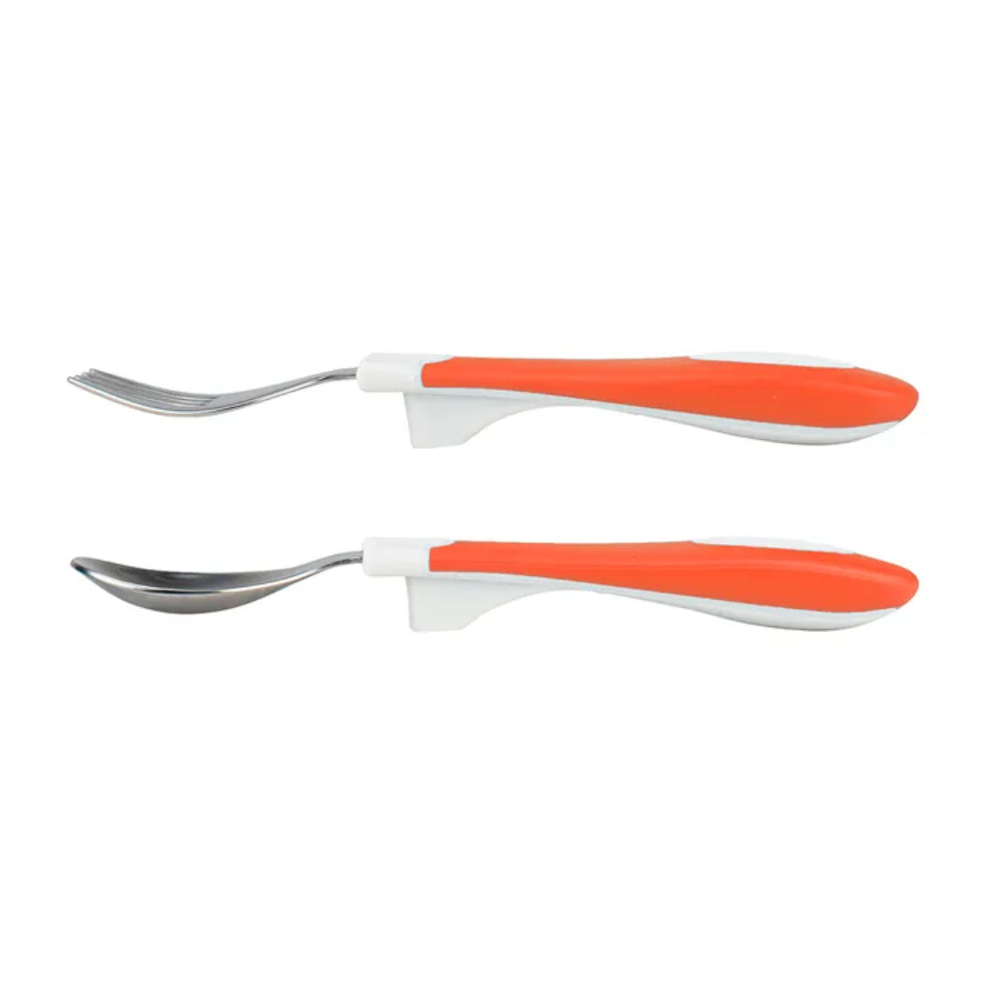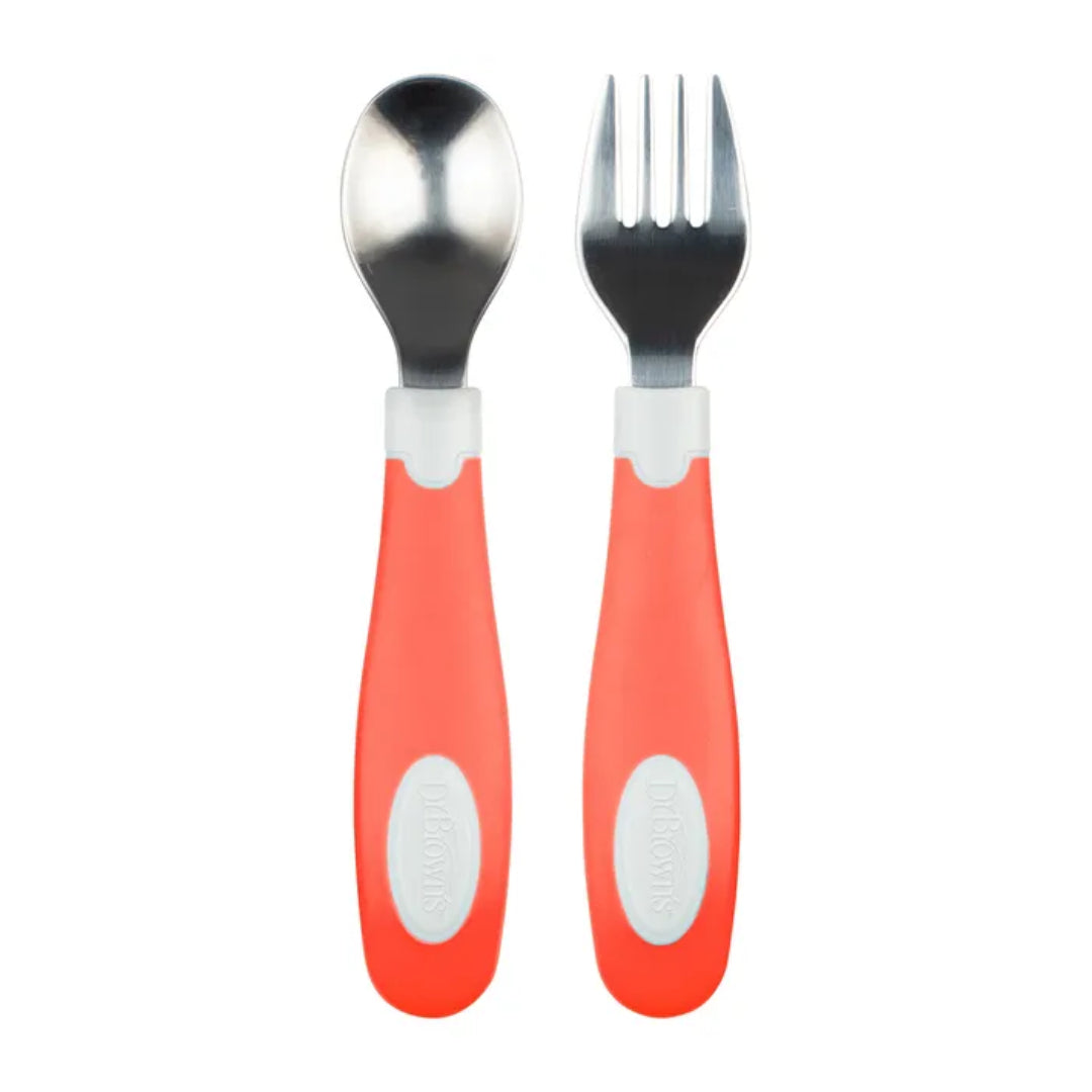 Help your toddler get a firm grip on self-feeding with the Dr. Brown's Designed to Nourish Soft-Grip Spoon and Fork set. This toddler-sized set of stainless steel silverware helps your little one to get the hang of holding their fork and spoon independently. True to name, the Soft-Grip Spoon and Fork handle is comfortable and cushy, with rounded safety edges to make mealtime feel even better. , , A wide, textured grip help learning hands to hold steady, while the durable metal design stands up to even the strongest of food flingers. The touch-free base helps keep the mess off the table and germs off the utensil. Plus, the spoon and fork set is dishwasher and sterilizer safe! Soft-Grip Spoon and Fork silverware set includes one spoon and one fork. BPA free. 12m+.