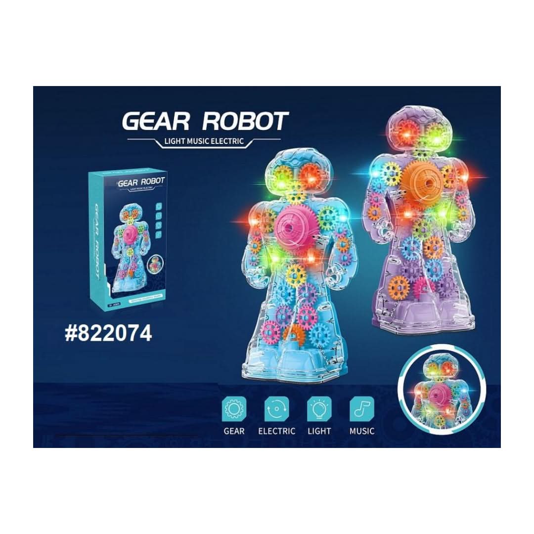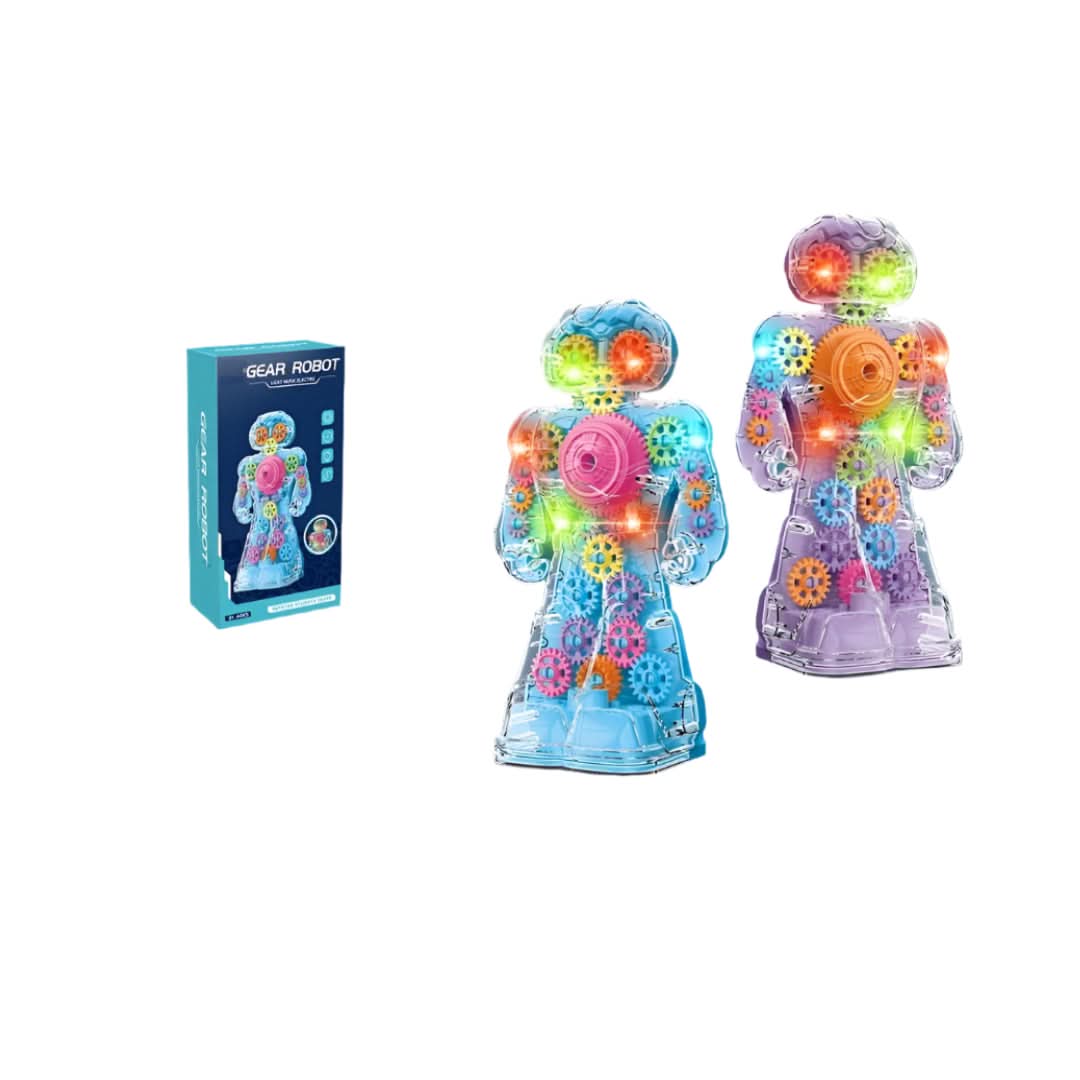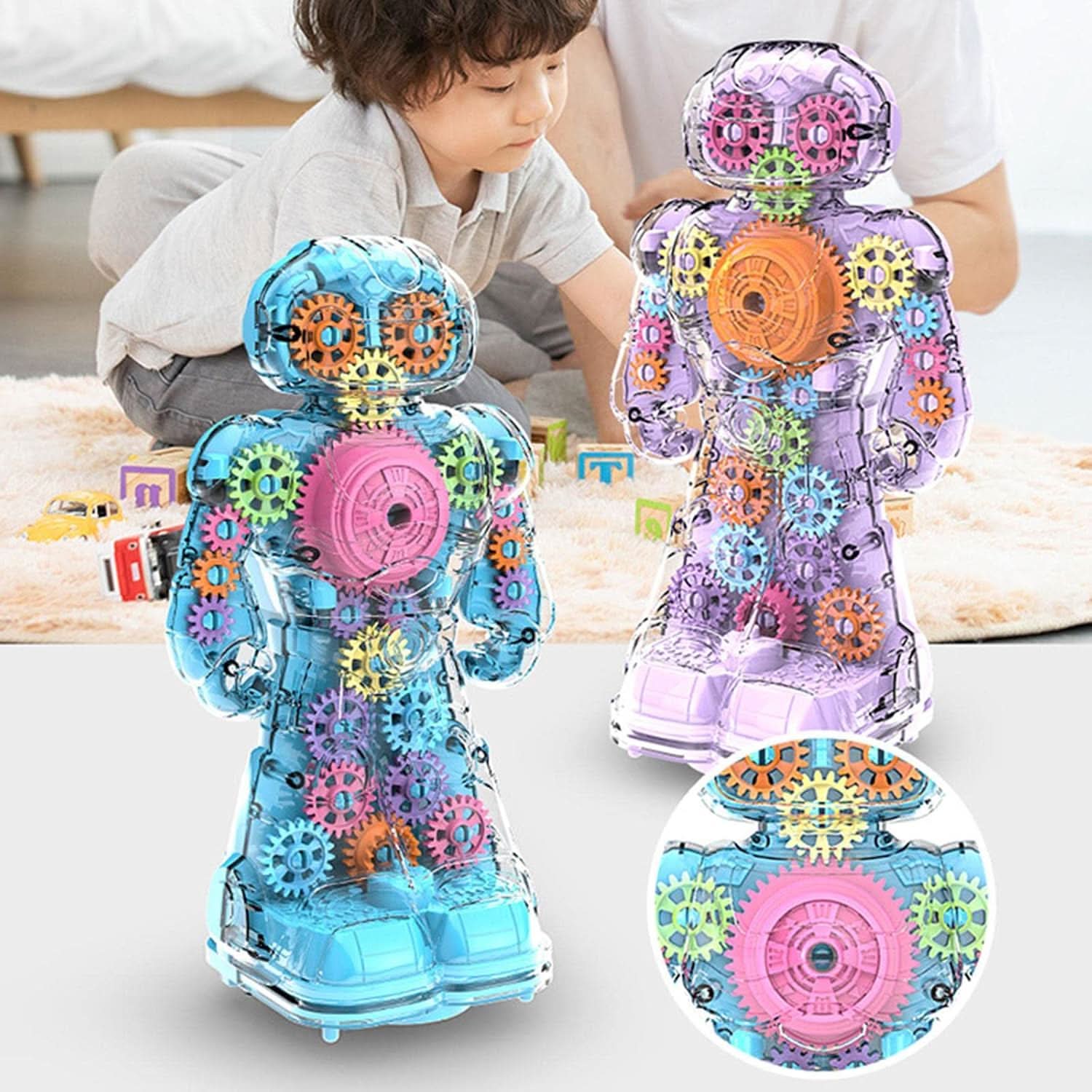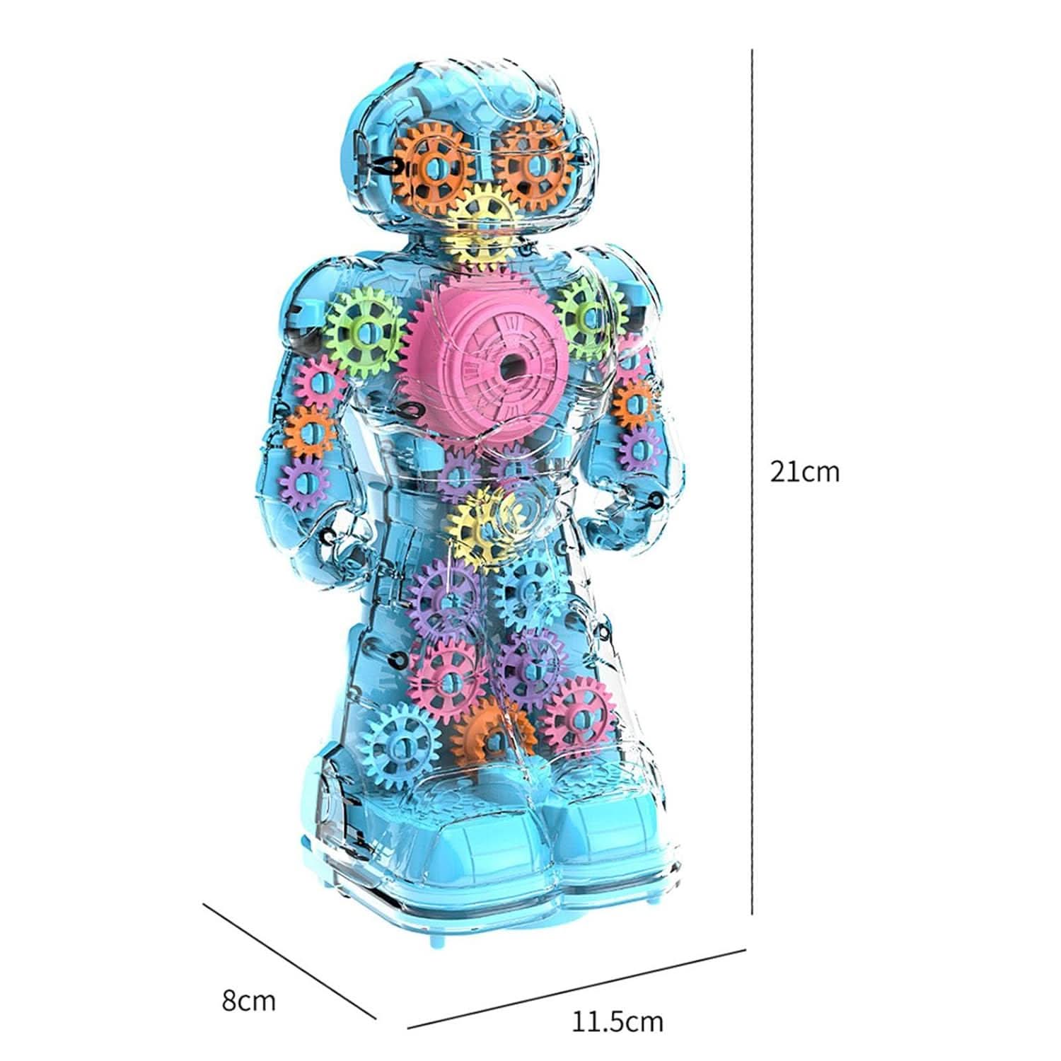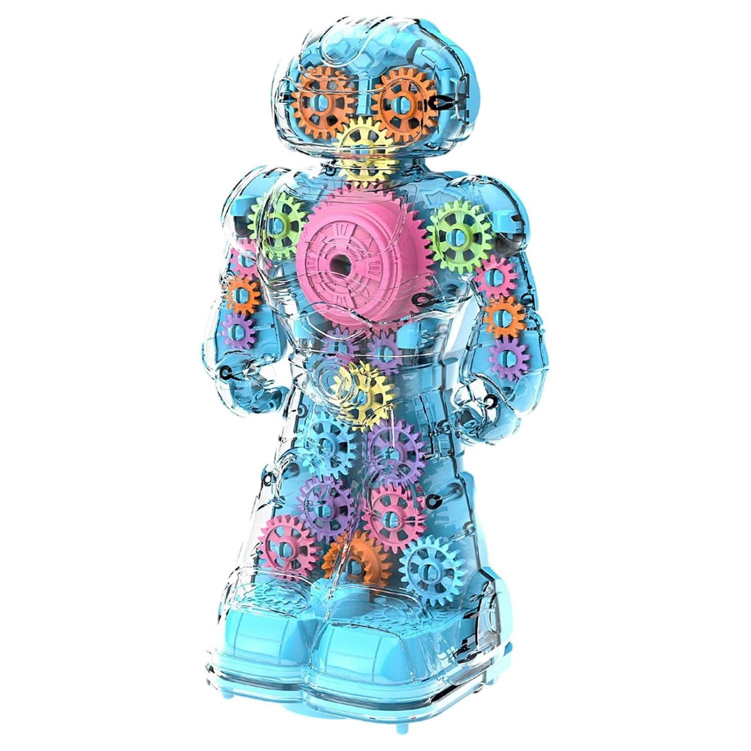 Electric transparent gear robot toy, the robot can advance like a balance car, and it will automatically turn to travel when it encounters an obstacle. The transparent design allows children to see the gears inside, helping children understand the mechanical concept. Random universal walk, colored lights, cool music. With music and colorful cool lights, attract children's attention and add fun to play. Let children learn while playing and improve their observation skills, need 3 AA batteries Not Included.