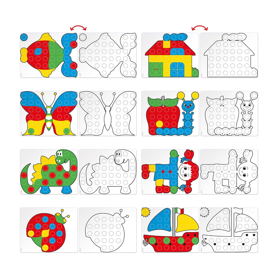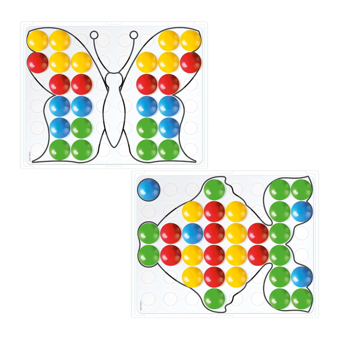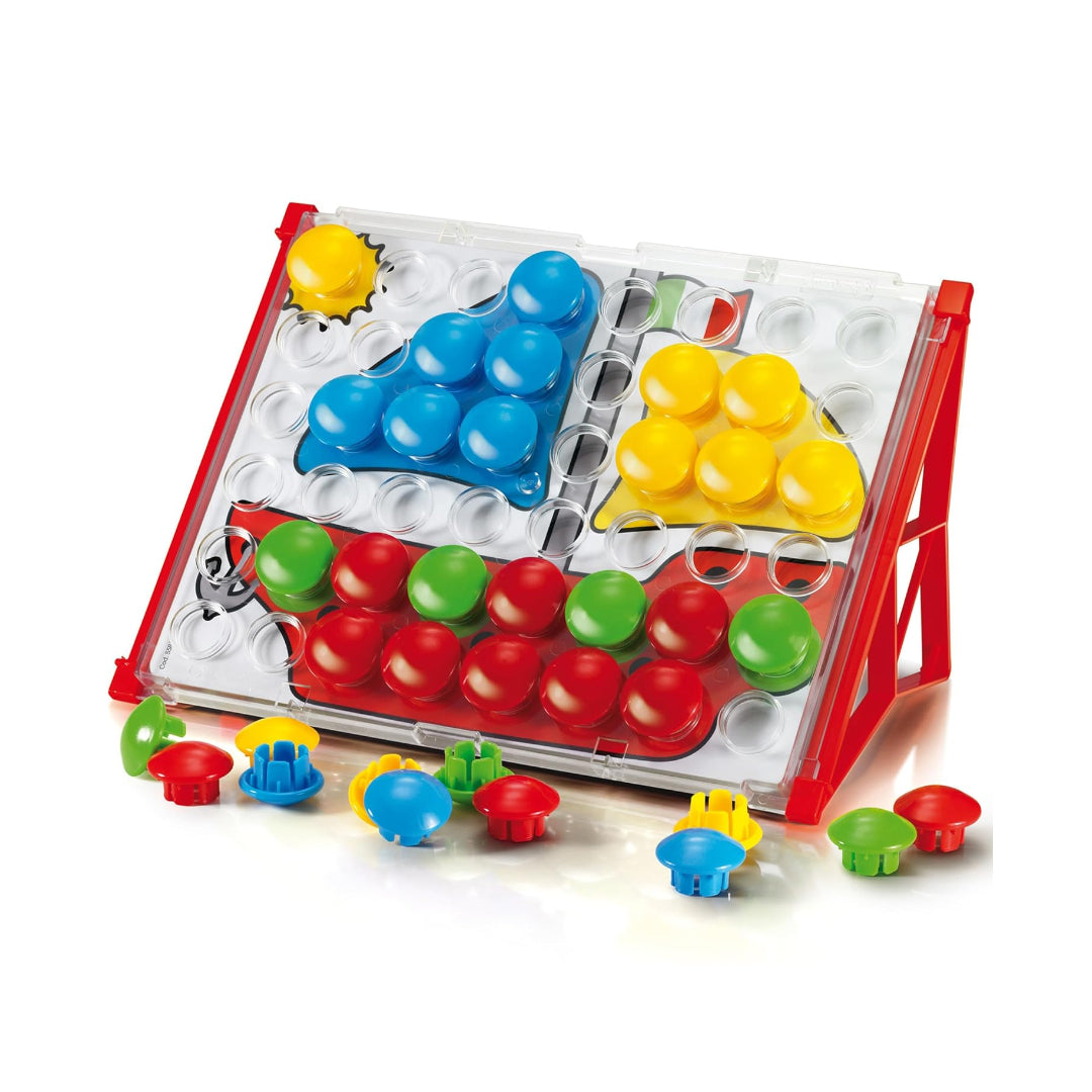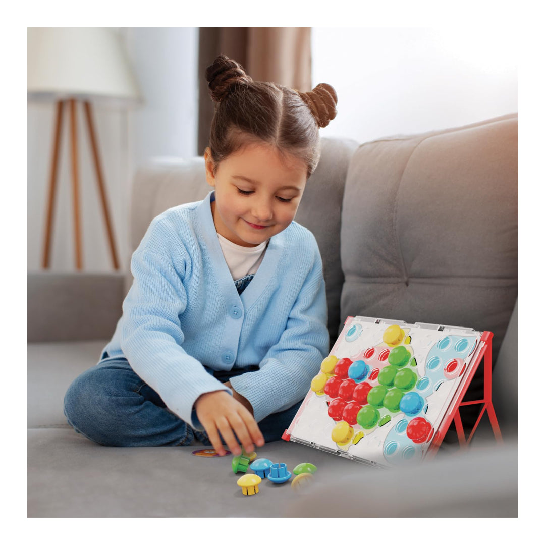 Toddler inserts large pegs in primary colors, in a see-through grid, to cover the matching shapes on the simple and bright model pictures.