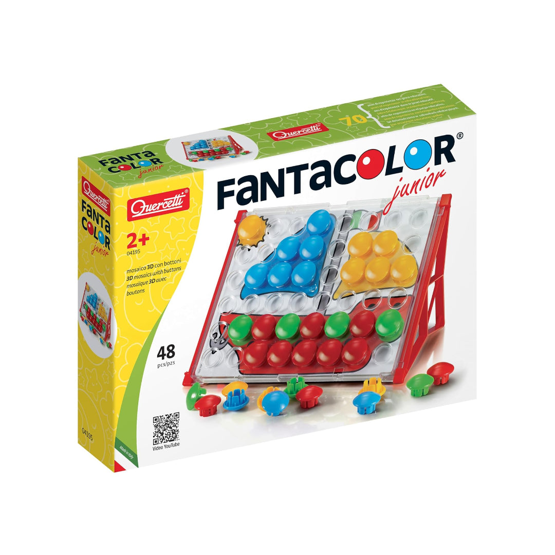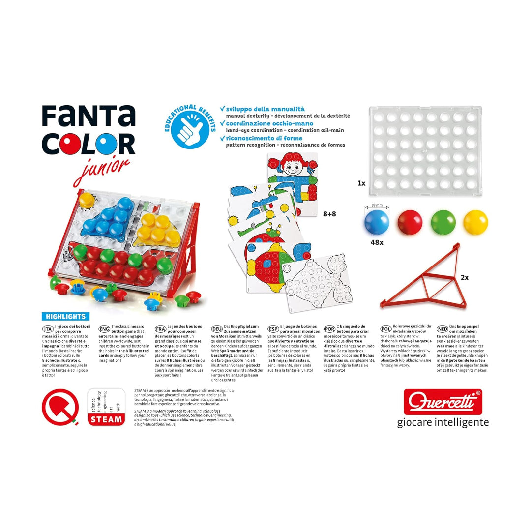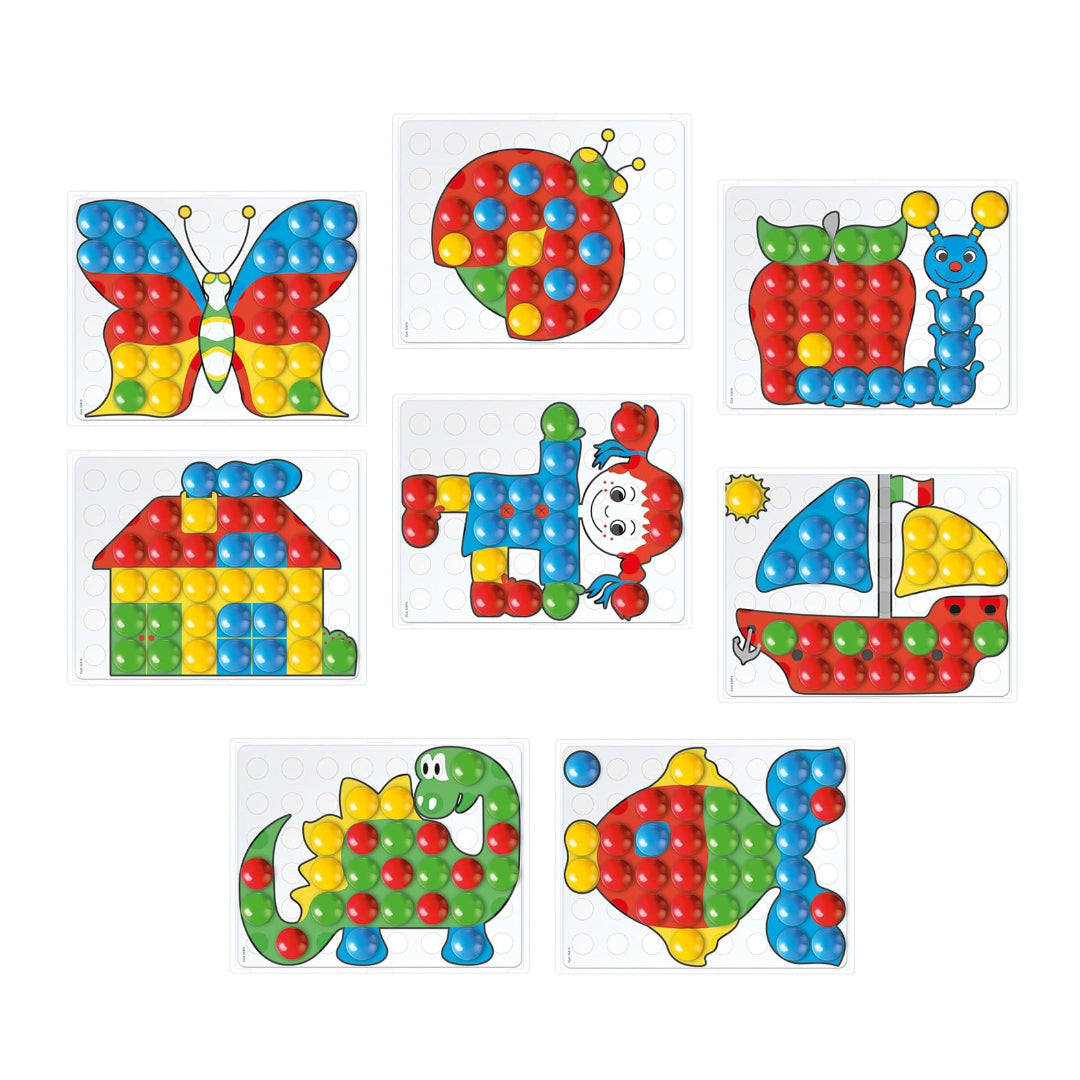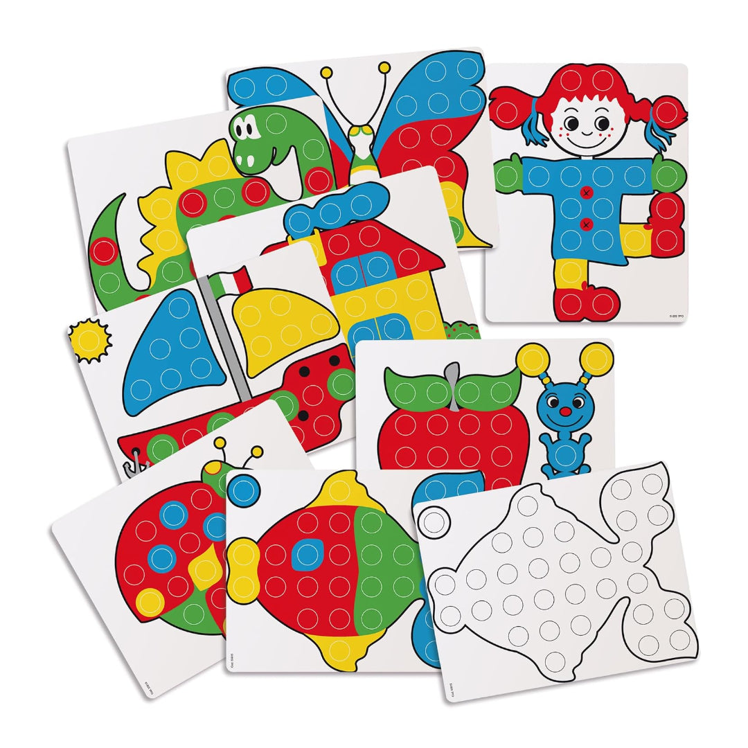 Toddler inserts large pegs in primary colors, in a see-through grid, to cover the matching shapes on the simple and bright model pictures.