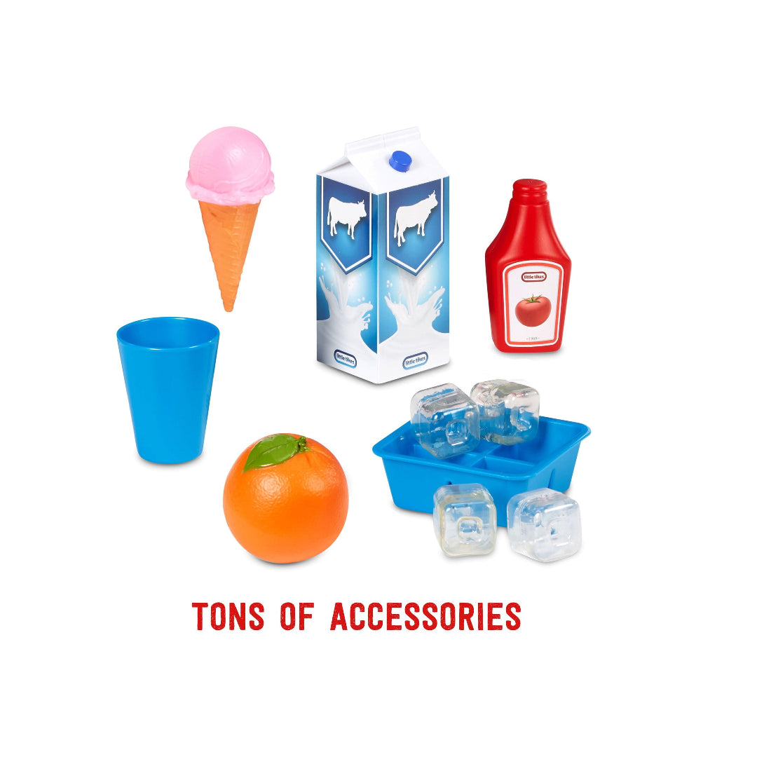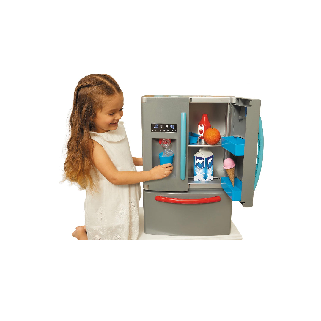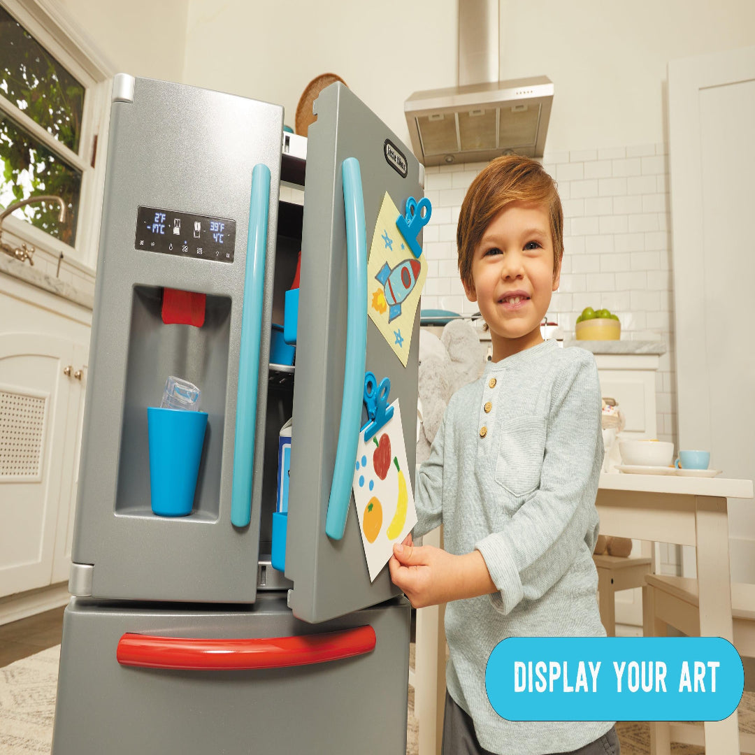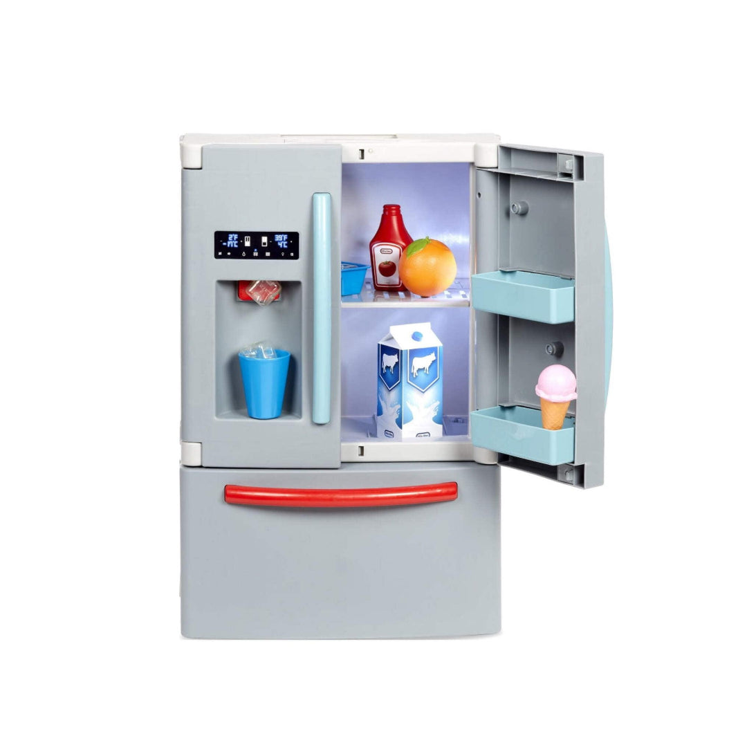 The Little Tikes First Fridge (Model 175060) is a realistic and interactive pretend play appliance designed to inspire imaginative role-play in children. This modern toy refrigerator features dual French doors that open to reveal an illuminated interior, enhancing the lifelike experience. It includes a separate pull-out freezer drawer equipped with a sensor that beeps when left open, promoting tidiness and responsibility. The working ice dispenser releases plastic ice cubes and produces sounds mimicking crushed ice and water dispensing, adding to the authenticity. Children can personalize the fridge doors using the provided clips to display grocery lists, artwork, or photos, fostering creativity. The compact design (15.8 inches wide x 11.5 inches deep x 23 inches tall) makes it suitable for small play spaces. The set comes with 11 accessories, including plastic ice cubes, a cup, and play food items, all of which can be stored inside the fridge for easy cleanup. This engaging playset encourages social-emotional learning by allowing kids to emulate real-life kitchen activities.