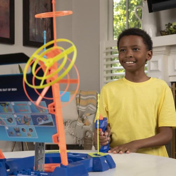 It's a skill and action game that's all about launching into the air! In the Sky Score game, players pull the lever on their launcher to send their sky spinner flying, aiming to land right through the poles and on the zones on the board. It takes skill, patience, and a bit of luck to get the feel when pulling the lever. Rack up big points and keep playing until one player has landed all four of their spinners in the scoring zones. Keep going for the ultimate drop -- right through the backboard slot for an instant win. Sky Score is a fun game to play solo or with friends. The game unit folds up for easy storage. It makes a great gift for kids ages 8 and up.