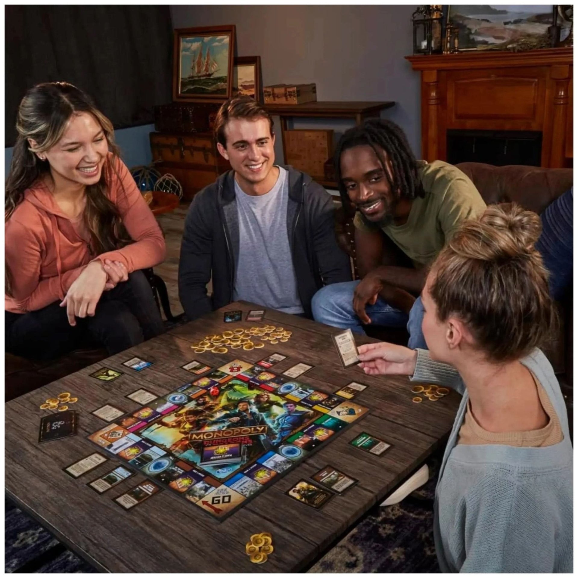 Adventure across a land of magic and monsters with the Monopoly Dungeons & Dragons: Honor Among Thieves game, inspired by the D&D movie! This immersive board game features key characters and locations from the film. Players can explore the Forgotten Realms as part of an intrepid adventuring party. Discover adventure around the Sword Coast and the perilous Underdark, seek out useful items and powerful spells, and collect treasure. But watch out for monsters, devious Red Wizards, and backstabbing rogues! The game ends when all locations have been secured. The player with the most gold wins! This D&D adventure game is for ages 8 and up, and it makes a great gift for fans of Dungeons & Dragons and the Monopoly game. © 2022 eOne and Paramount Pictures Corporation. All Rights Reserved. Dungeons & Dragons and all related trademarks and logos are trademarks of Wizards of the Coast. ©2022 Wizards of the Coast.