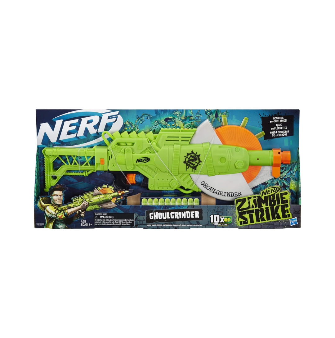 If you can't beat 'em -- grind 'em! The Nerf Zombie Strike Ghoulgrinder blaster has a rotating, 10-dart wheel that resembles a grinding wheel tool. Move the bolt to prime the blaster, and press the trigger to fire 1 dart. The wheel indexes to the next dart when you prime. It includes 10 Official Nerf Zombie Strike darts that are tested and approved for performance and quality. There's onboard 5-dart storage to keep backup firepower in reach when the zombies are coming at you thick and fast. The stock is removable, and the barrel has an attachment point, so you can customize with Nerf Zombie Strike accessories (not included). The blaster has design features to capture the story of kids building zombie-fighting gear from anything they can find -- like a grinding wheel, a screwdriver, and other parts and pieces. The zombies will grind to a halt when you take aim with the Ghoulgrinder blaster! Powered by you -- no batteries needed.