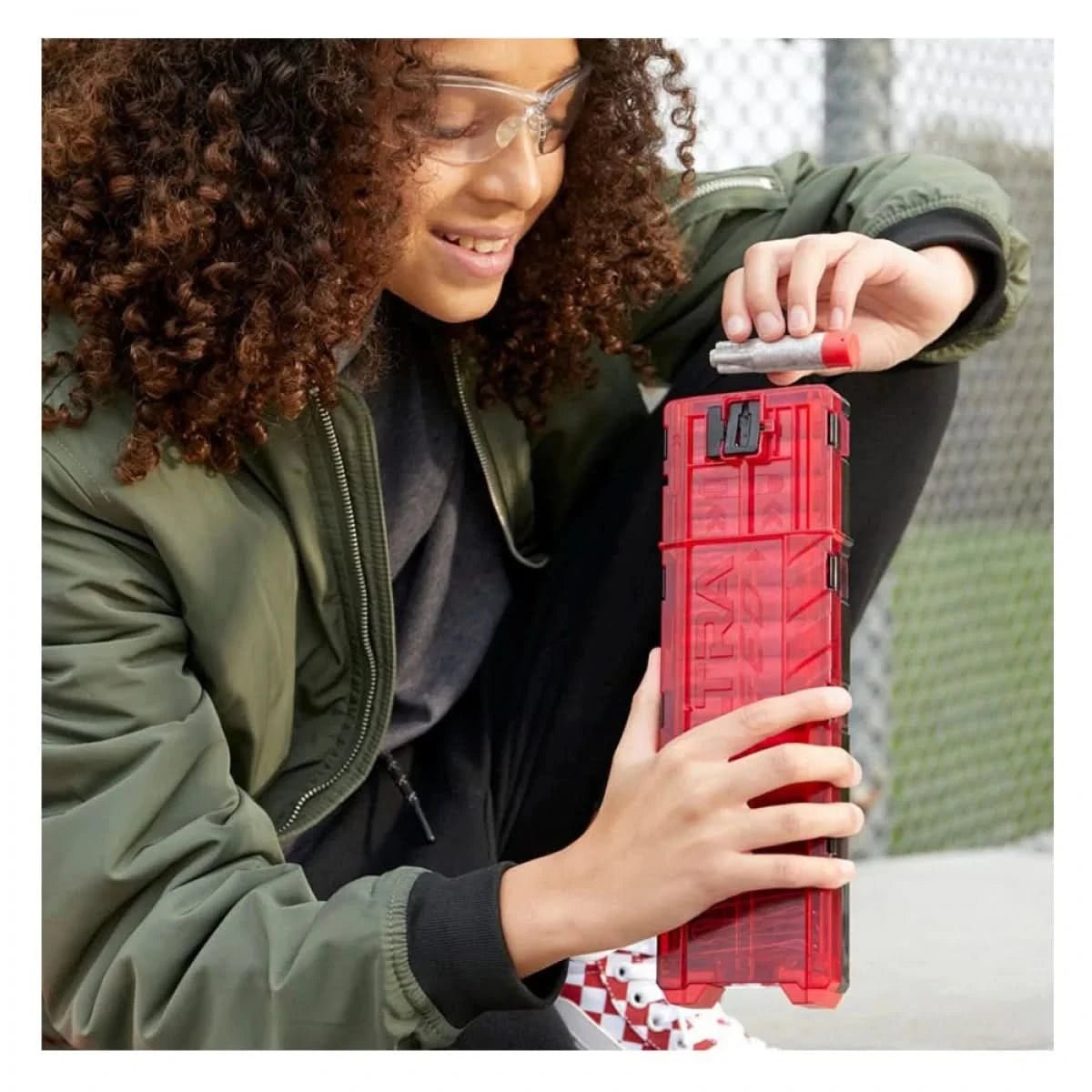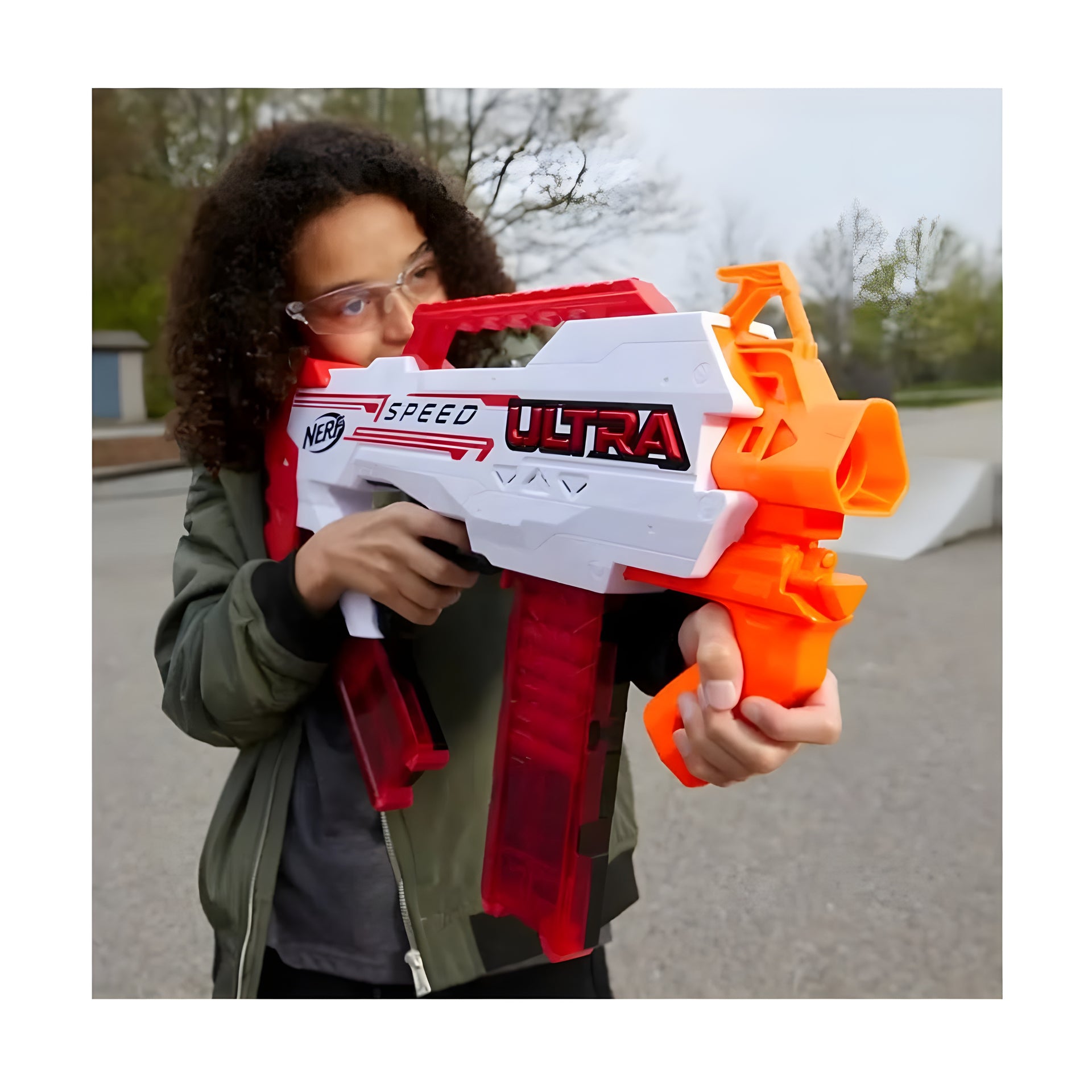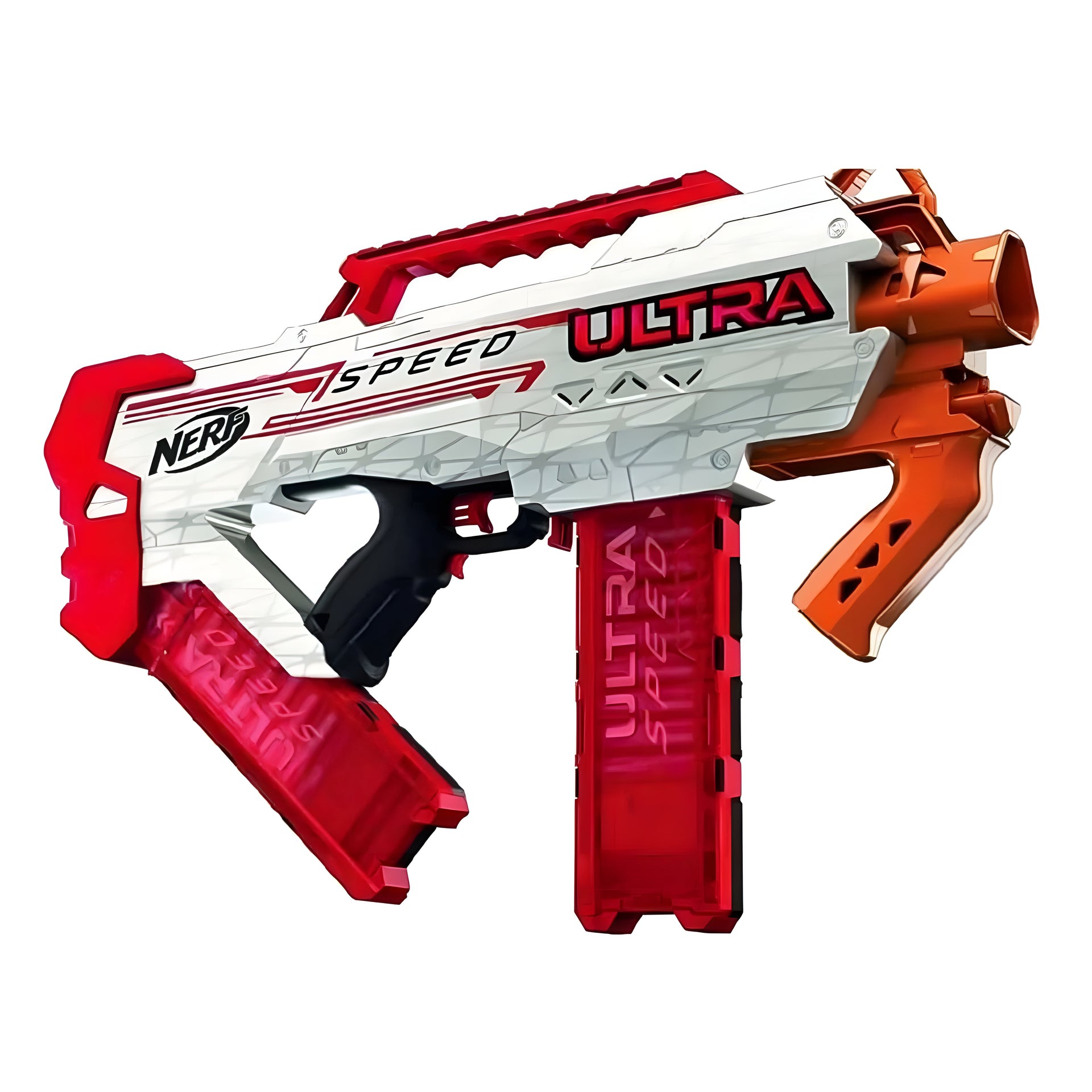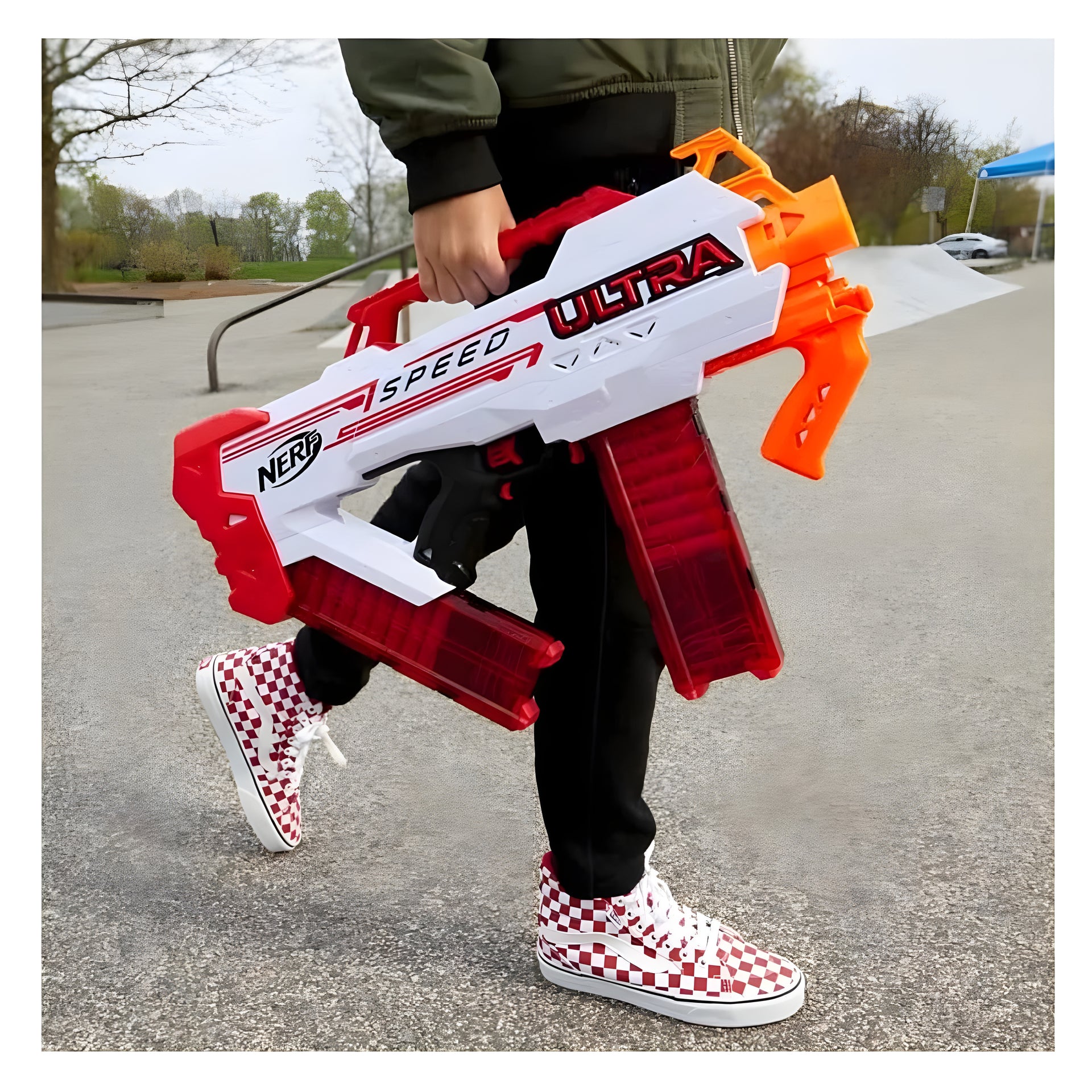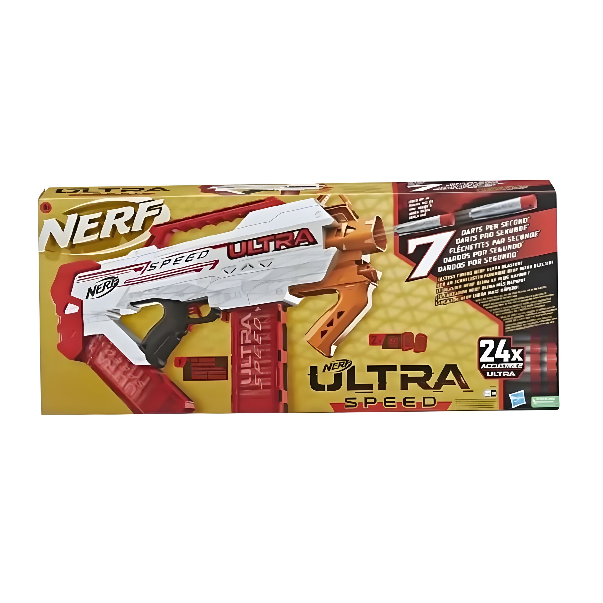Nerf Ultra Speed blaster is the fastest-firing Nerf Ultra blaster, unleashing 7 darts per second*! Bring superior speed to the battle with this fully motorized blaster. It includes two 12-dart clips -- launch a dozen darts in a row from 1 clip, then load the second clip to pour on a dozen more. The blaster includes 24 Nerf Accu Strike Ultra foam darts, the most accurate Nerf Ultra darts. With speed and accuracy at your fingertips, you're ready to take the lead in Nerf games. Includes a drop grip to stabilize your aim and an integrated carry handle. Load a clip into the blaster, hold down the acceleration button to power up the motor, and pull the trigger to fire the darts
