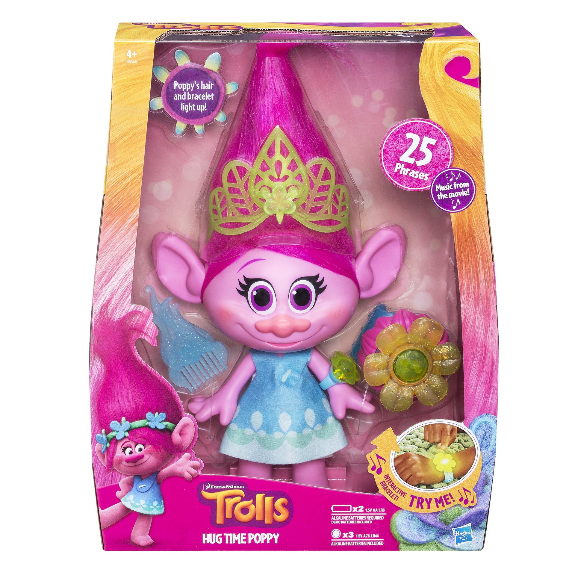Just in time for hugs. DreamWorks Trolls Poppy is a lovable, colorful princess who always takes a break for Hug Time, no matter where her adventures take her. Inspired by the DreamWorks Trolls movie, Hug Time Poppy stands 14 inches tall and speaks 25 phrases when you press her tummy. She even plays songs from the film because with a song in your heart, you can do anything. Rock her back and forth so that it looks like she’s dancing to the beat. Kids can wear a light up bracelet just like the doll’s when activated, their matching bracelets and the doll's hair all light up to the beat of the music. Give her a hug and join the fun. Product Features: Includes doll, dress, tiara, comb, and interactive bracelet DreamWorks Trolls Poppy plays songs and speaks 25 phrases Brush her wild hair that lights up with the music Interact with her using light-up bracelet Doll and accessories from the DreamWorks Trolls movie