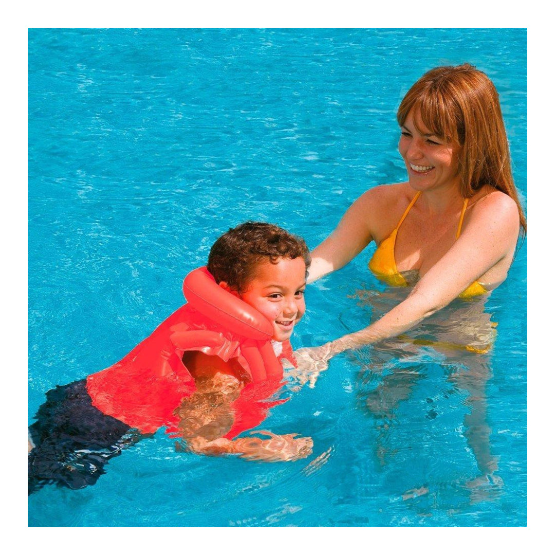 Deluxe swim vest 3 air chambers including an inflatable collar 2 quick release adjustment buckles pegable box 25 mm vinyl age - 3 years to 6 plus years Size: 19.5 X 18.5 ( 50cm x 47 cm) inflammable for swimming floater. Intex Deluxe swim vest.