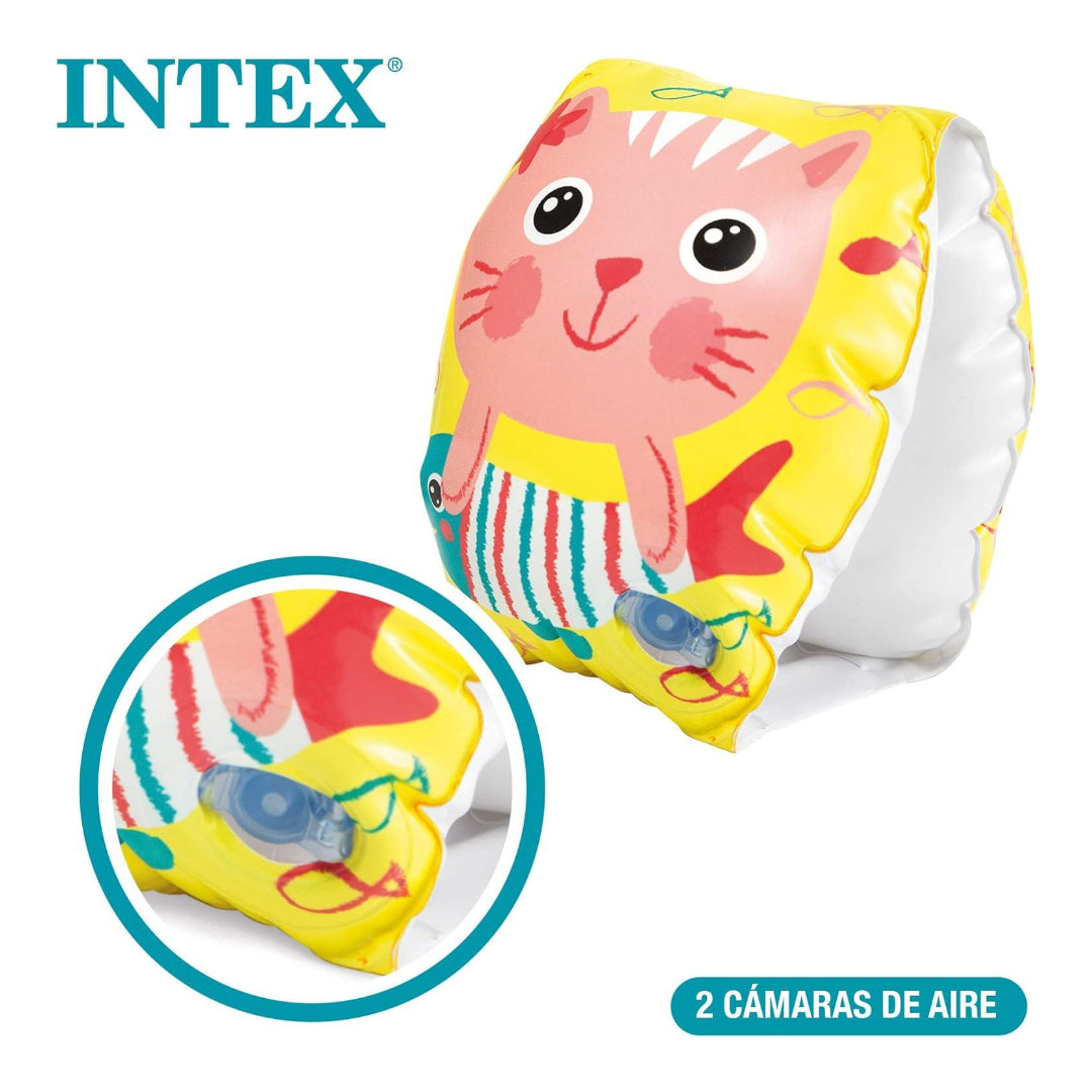 The Intex Happy Kitten Arm Bands are inflatable swim armbands designed for children, featuring a cute kitten design and two independent air chambers for enhanced safety.