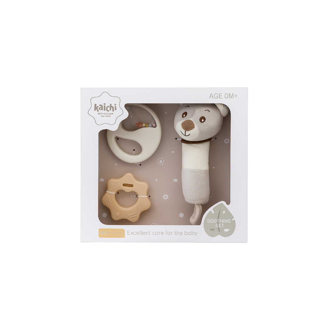 The Kaichi Baby Soothing Set is thoughtfully designed to provide comfort, sensory stimulation, and early playtime interaction for newborns. Perfectly curated for infants aged 0 months and up, this set includes three gentle and safe components that encourage a baby’s early development while keeping them calm and entertained. Set Includes: Soft Plush Rattle (Bear Shape) Adorable, friendly bear design Made of soft, baby-safe fabric Gentle rattling sound encourages auditory development Easy-to-grip shape for tiny hands White Plastic Rattle with Beads Ergonomic loop design Colorful beads inside a clear dome promote visual stimulation and sound response Lightweight and safe for teething and grasping Teething Toy (Star-Shaped) Made from BPA-free soft plastic Ideal for soothing sore gums Stimulates tactile senses with varied textures Features: Safe for Newborns: All components are non-toxic and meet safety standards Stimulates Development: Engages hearing, vision, and touch Perfect Gift Option: Comes in a beautifully packaged window box Portable and Lightweight: Easy to carry in a diaper bag for play on the go Brand: Kaichi Tagline: “Baby’s Growth, Our Faith”