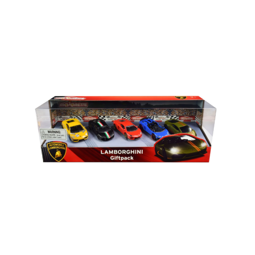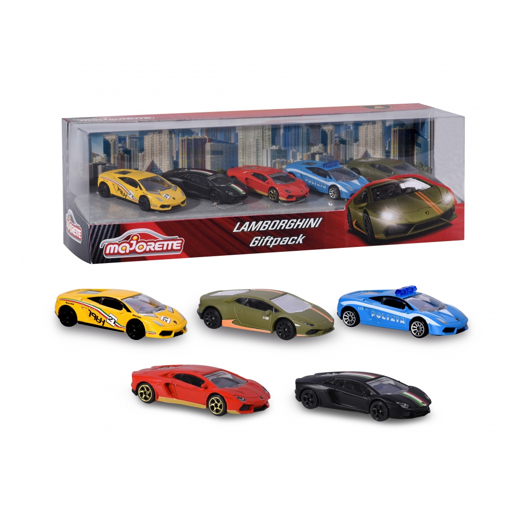 Brand new 1/64 scale diecast car models of Lamborghini Giftpack 5 piece Set die cast model cars by Majorette.Brand new box.Real rubber tires.Die-cast metal body.Officially licensed product.Detailed exteriors, interiors.Do not have any openings.Dimensions of each model is approximately L-2.75 inches long.