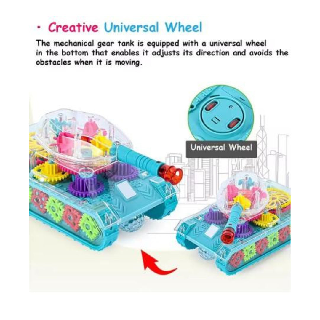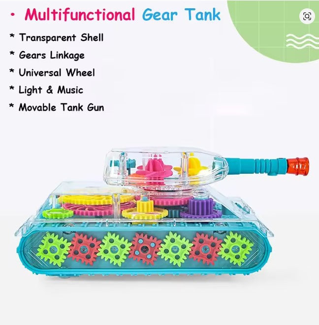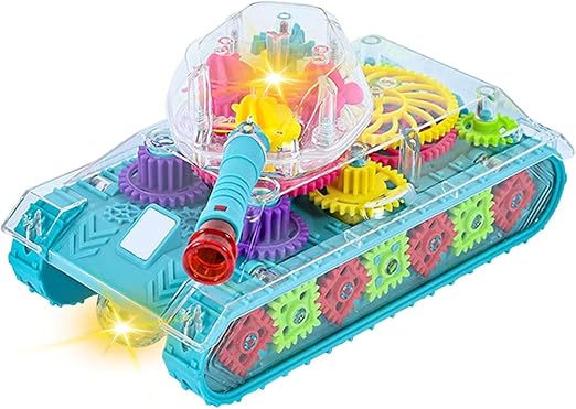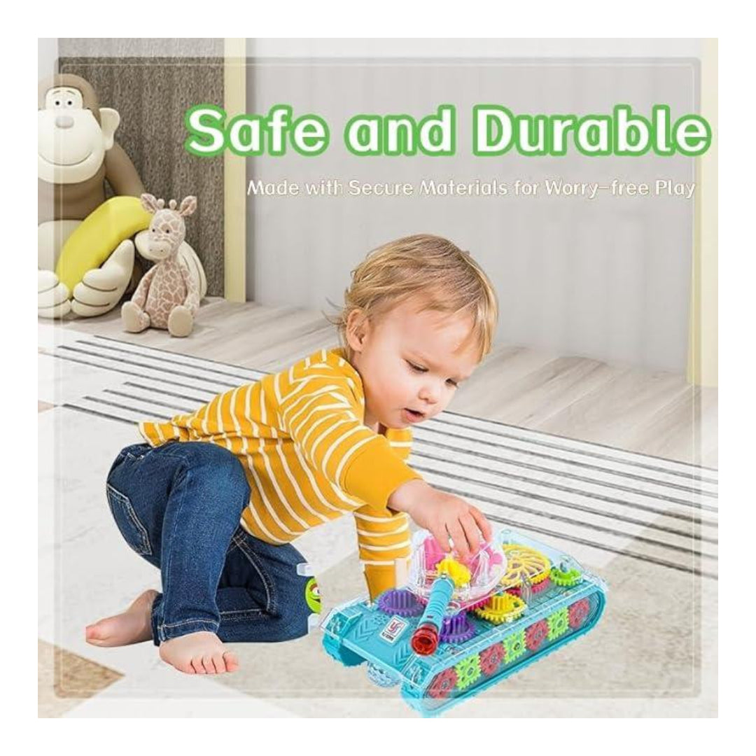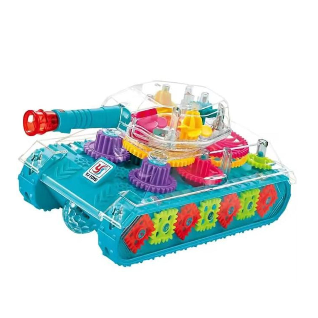 This colorful gear-operated tank toy is a vibrant and engaging toy designed to captivate young minds through visual stimulation, movement, and mechanical interaction. With a transparent shell revealing the colorful internal gears, this educational toy helps children understand basic mechanical concepts while having fun. It’s perfect for toddlers and young kids who love moving toys with lights and sounds.