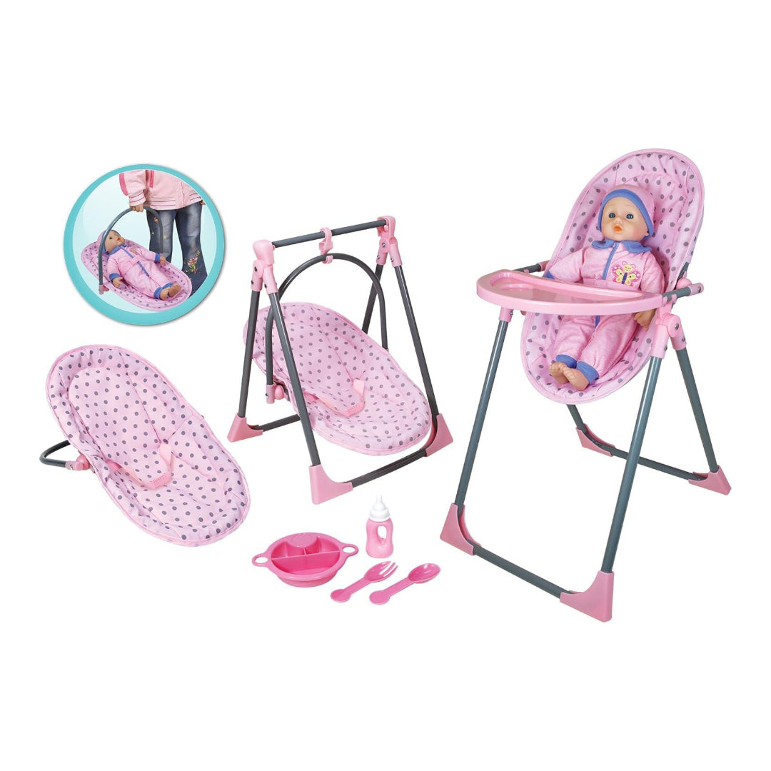 Whether you're heading off on a day out with your little friend or keeping her entertained when it's time to play, you'll love looking after your very own little one with this adorable set. The Highchair transforms into a swing, carrier and comfort chair to help you roleplay lots of different activities.