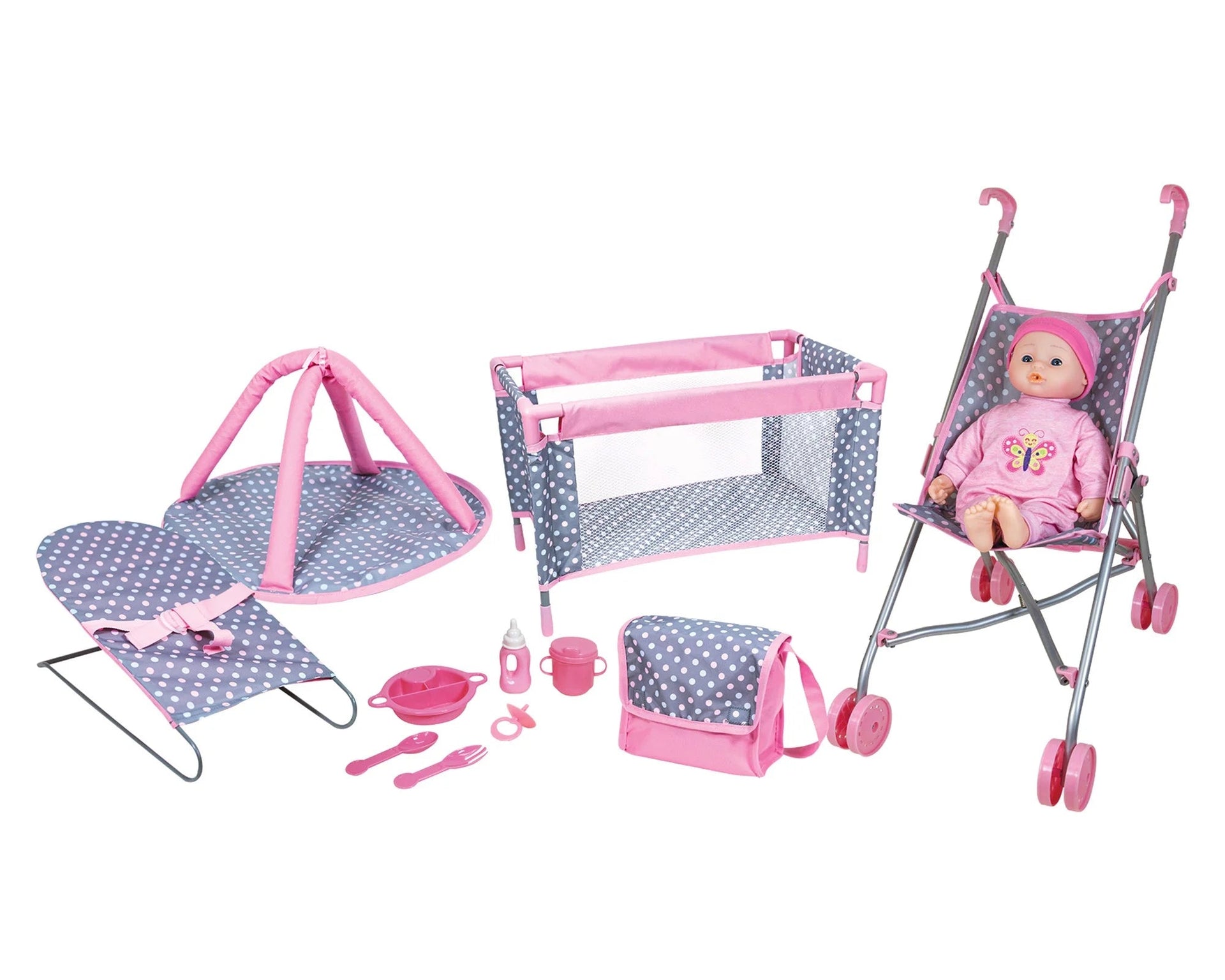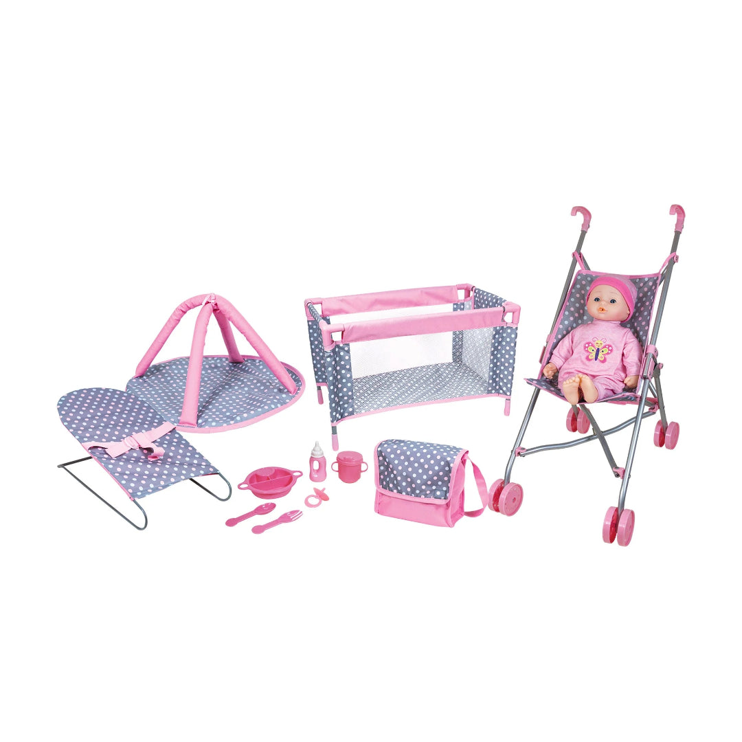 Includes: 16 inch baby doll, folding stroller, travel bed, bouncer, playpen, and carry bag with 6 play accessories