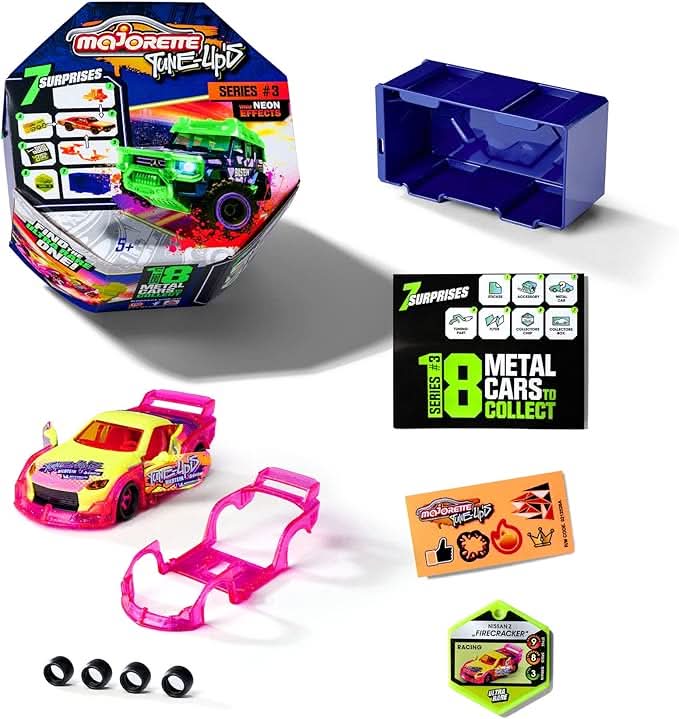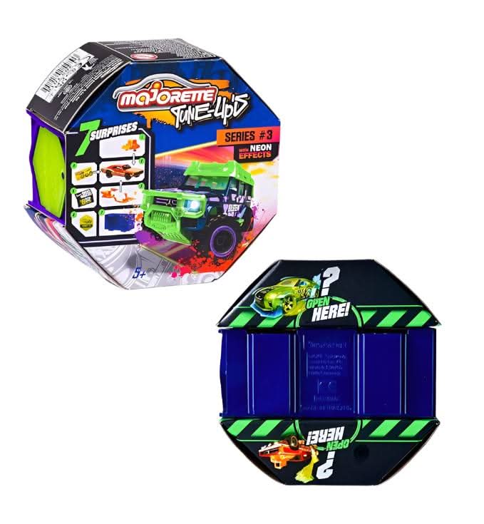 You will receive 1 of 18 spectacular Majorette cars from the 3 Tune ups series - with a cool neon look and exciting tuning parts! The selection is random. 18 original tuning models – each car model impresses with its bright paintwork and powerful equipment, rare models with eye-catching special paintwork and unusual body kits. Powered by Grip Motorsports Magazine Popular tune up cars (7.5 cm each) provide hours of driving, playing and tuning fun for girls and boys from 5 years old perfect as a gift! Dodge, Volkswagen, Ford, Mercedes-Benz, Audi or Toyota: miniature cars in metal, with freewheeling and partially opening parts, make your original elements honorable. 1 set with 7 surprises - in addition to the vehicle model, the set contains: 1 sticker sheet, 2 mounting elements for tuning, 1 collector's chip for replacement, 1 leaflet and 1 stackable storage box.