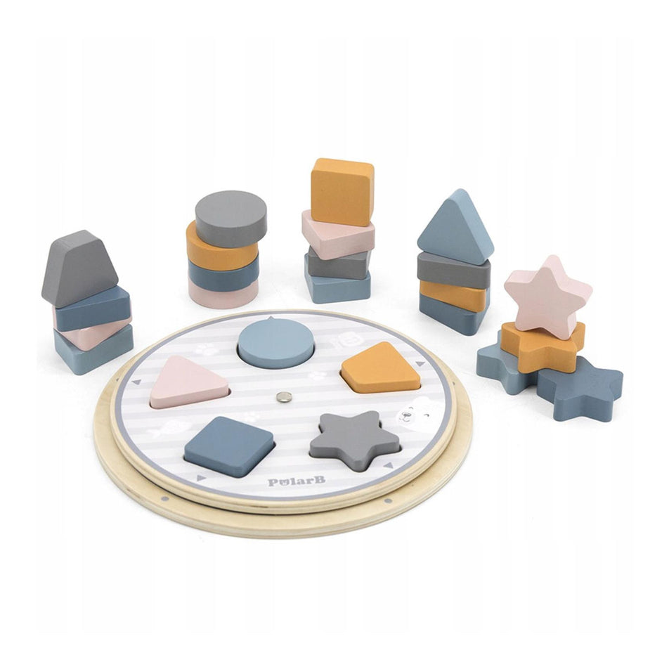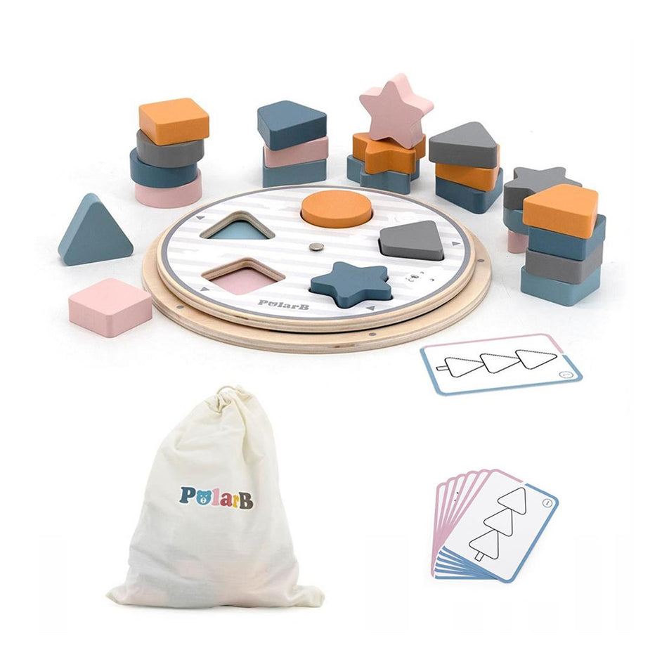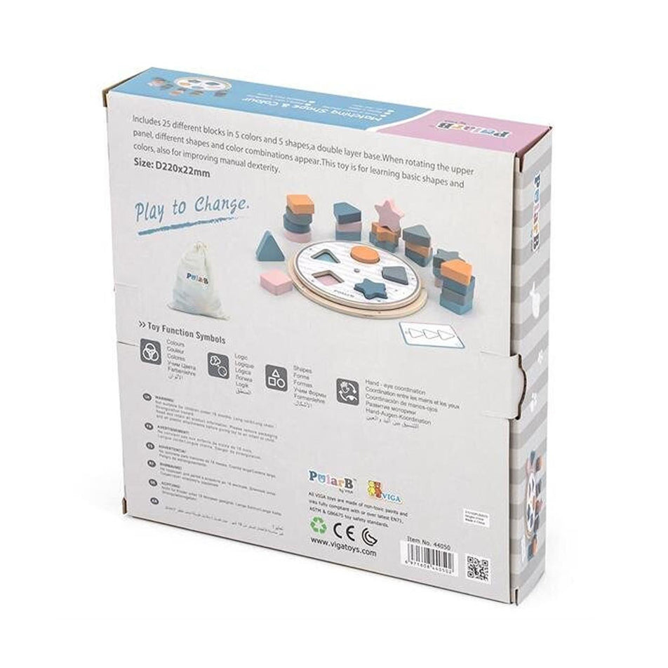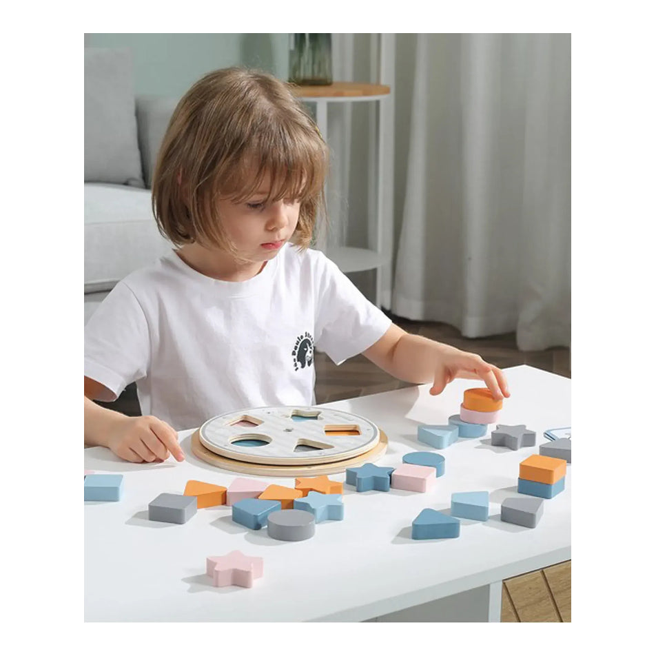 Match and stack the coloured shape block together to each label marked on the wheel! This Matching Shape & Colour Wheel Game is for learning basic shapes and colours that helps children learn to recognize shapes, colours, and develop sorting abilities. When rotating the upper panel, different shapes and color combinations appear. There are 5 different colors on the lower base and 5 different shapes on the upper panel that the children can match up the colours and shapes.