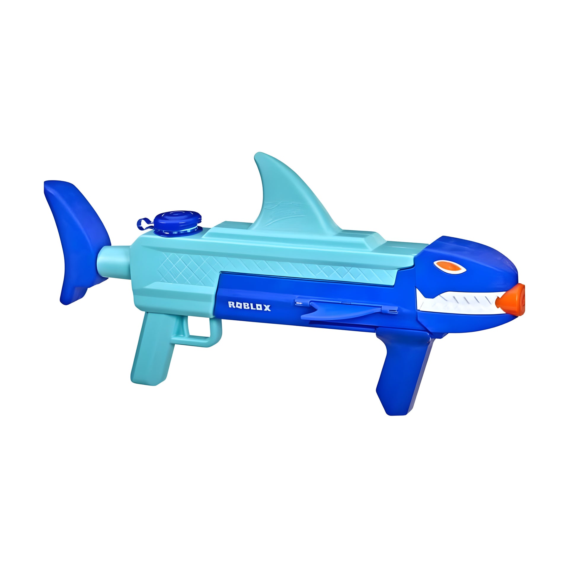 This Nerf Super Soaker Roblox SharkBite: SHRK 500 water-launching blaster takes its inspiration from the Roblox experience SharkBite by opplo and Simoon68! The blaster includes a special code that allows you to redeem an exclusive virtual item on Roblox!* Dive into drenching fun with this Nerf Super Soaker Roblox blaster in fun outdoor water battles. Show off your shark-iest skills as you soak opponents with streams of water. Open the cap, fill the tank with water, close the cap, then pump the handle backward and forward to swamp the competition!