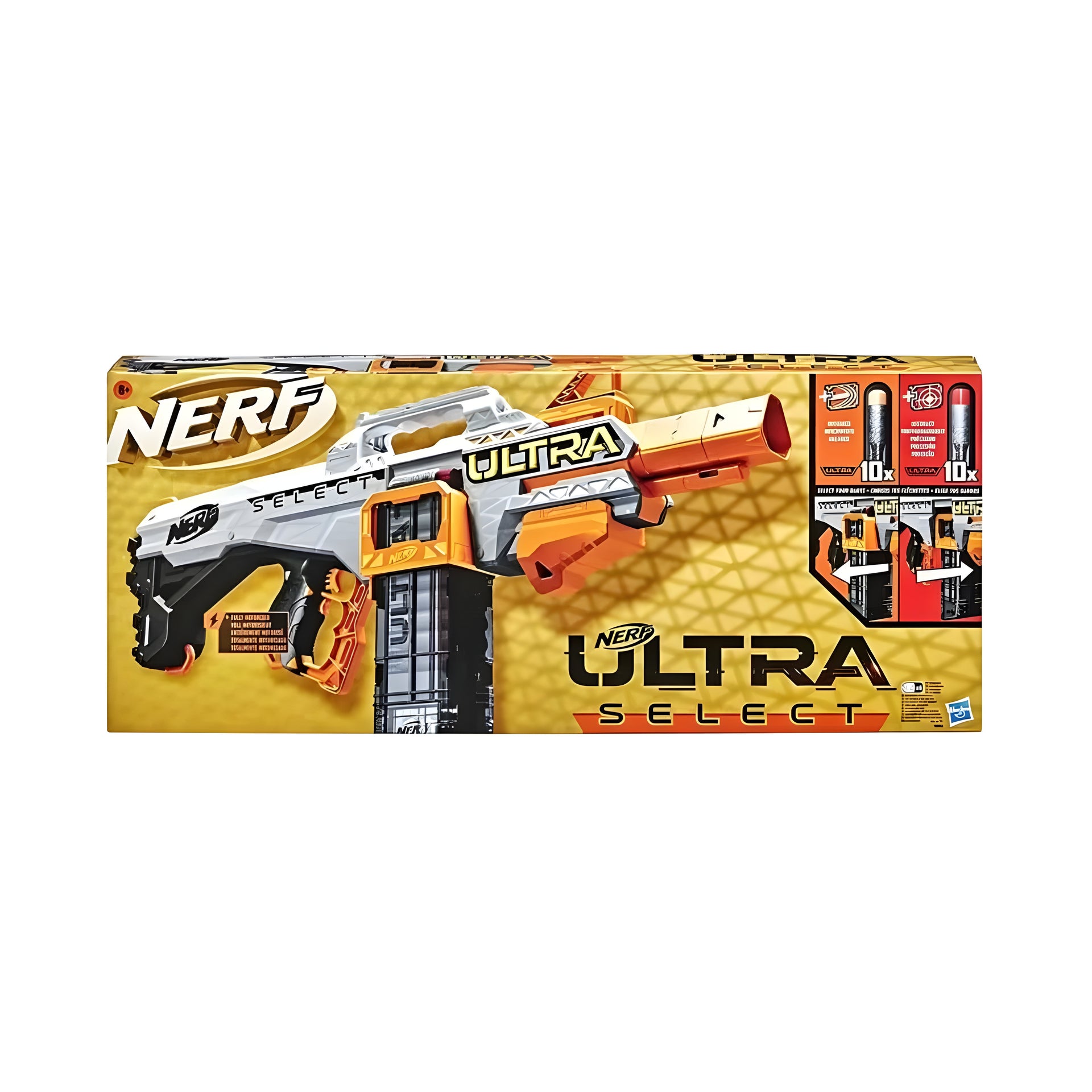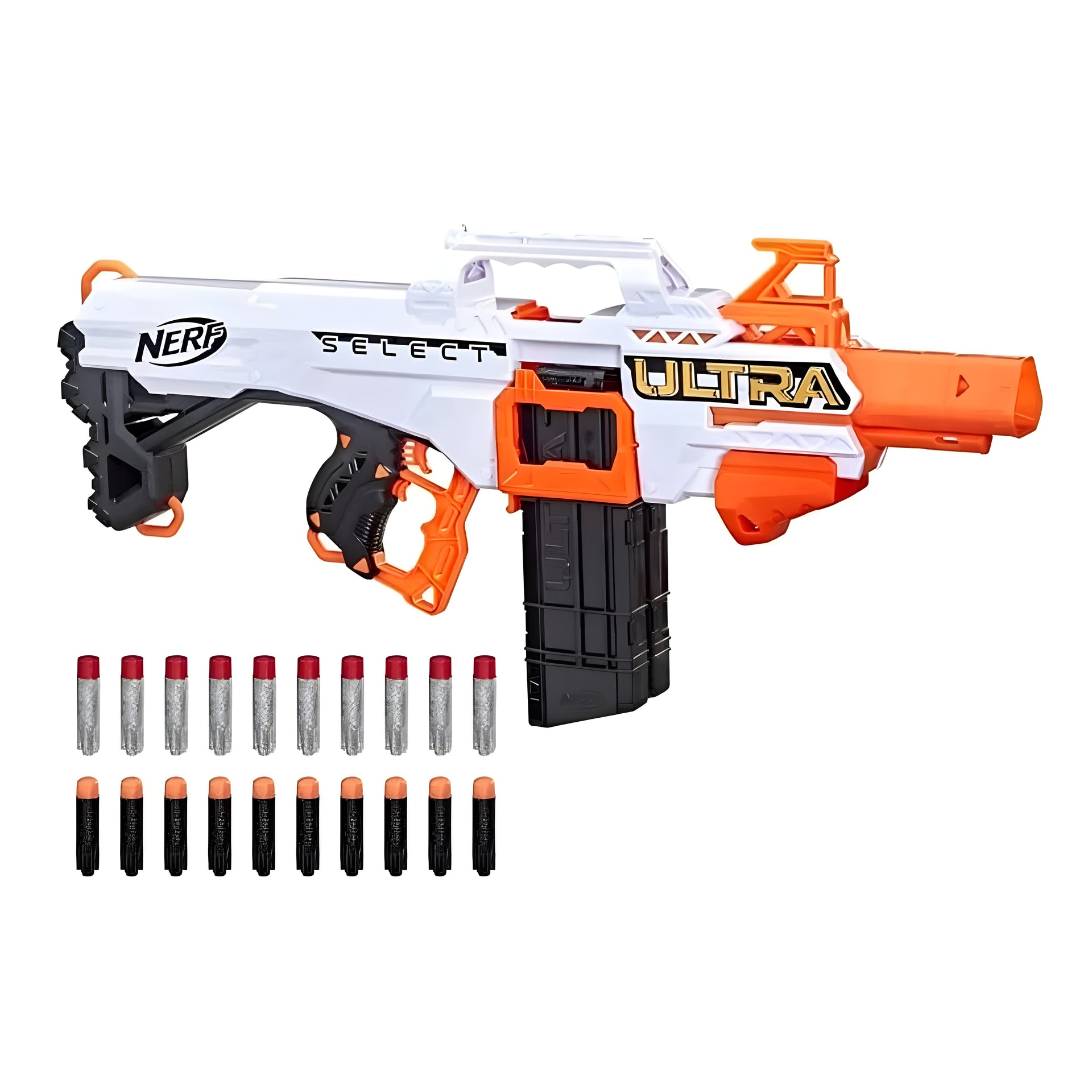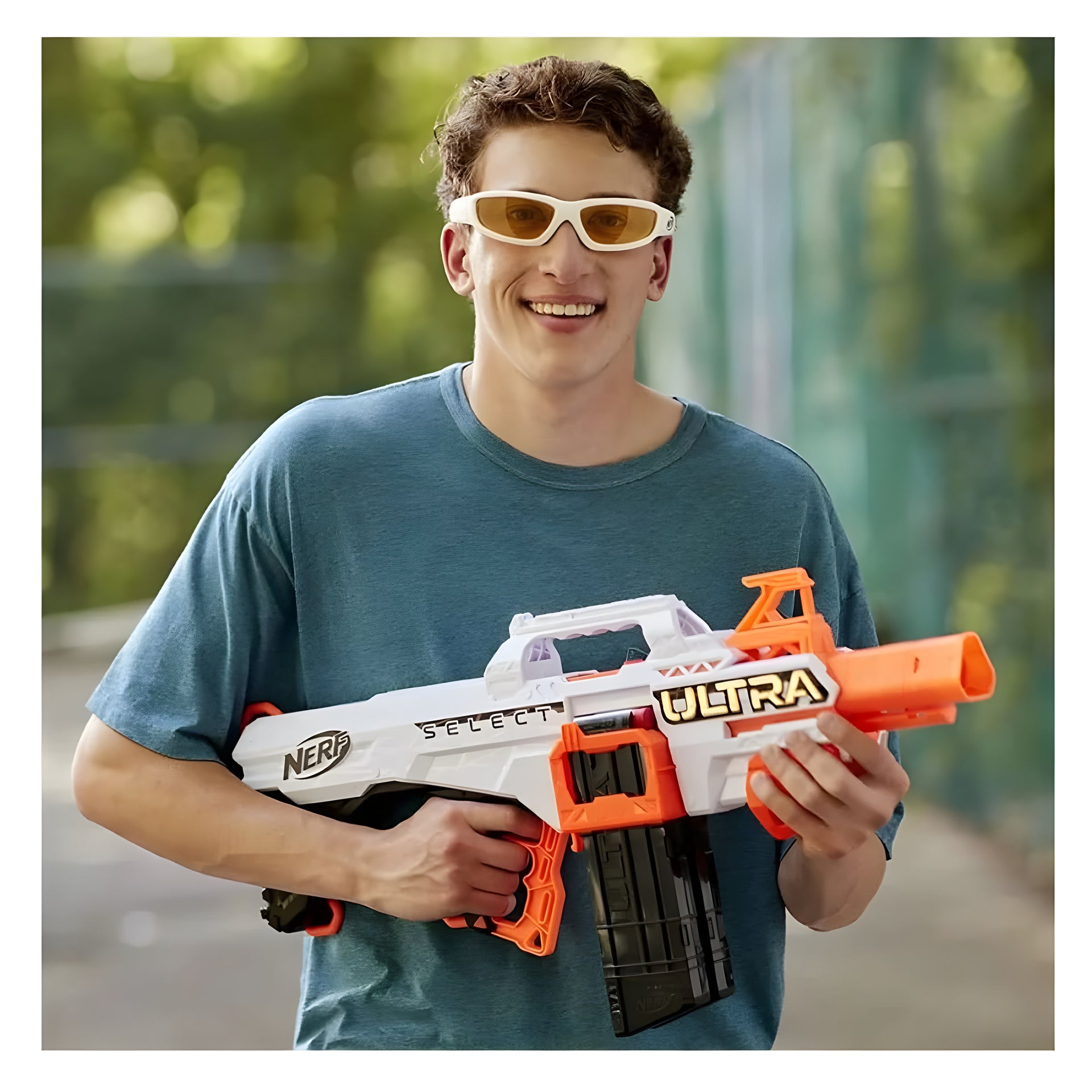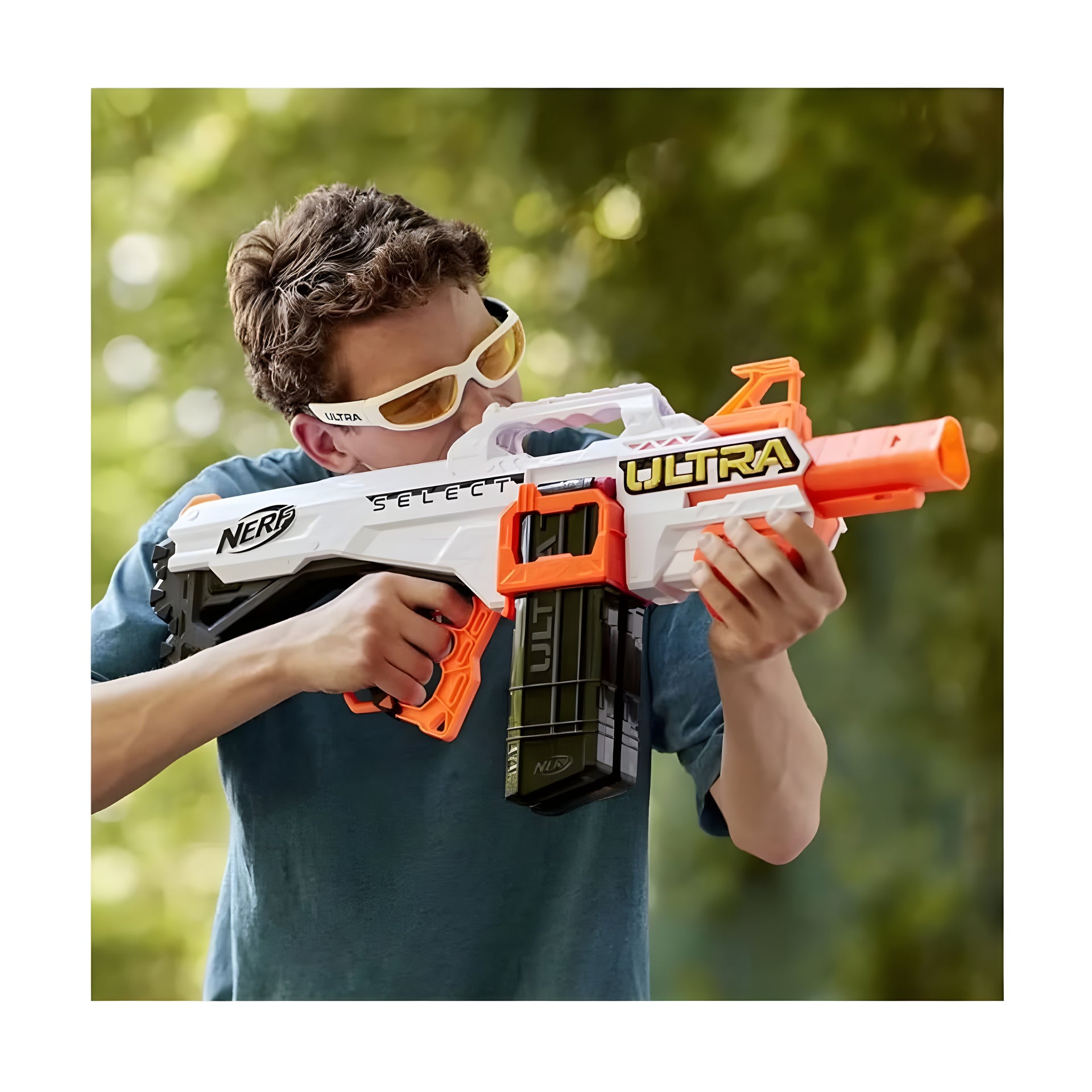 "Easily switch from accuracy to long-range shooting with the NERF Ultra Select. The blaster comes with two magazines for ten darts. Become the most accurate shooter or even the best long-range shooter with this NERF Ultra Select. It is equipped with two magazines, one for long range and one for accuracy. The set comes with a total of twenty NERF darts, ten of which are for every application, long range and accuracy. Furthermore, it is motorized, so you can just aim and keep shooting until your magazine is empty. You can also easily switch between the two different magazines with the selection button on the blaster."