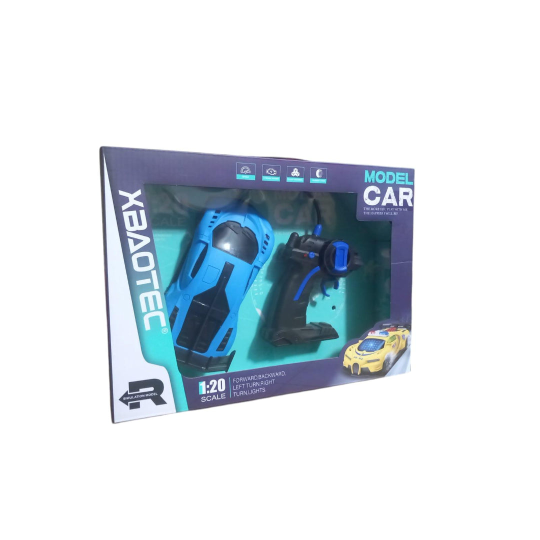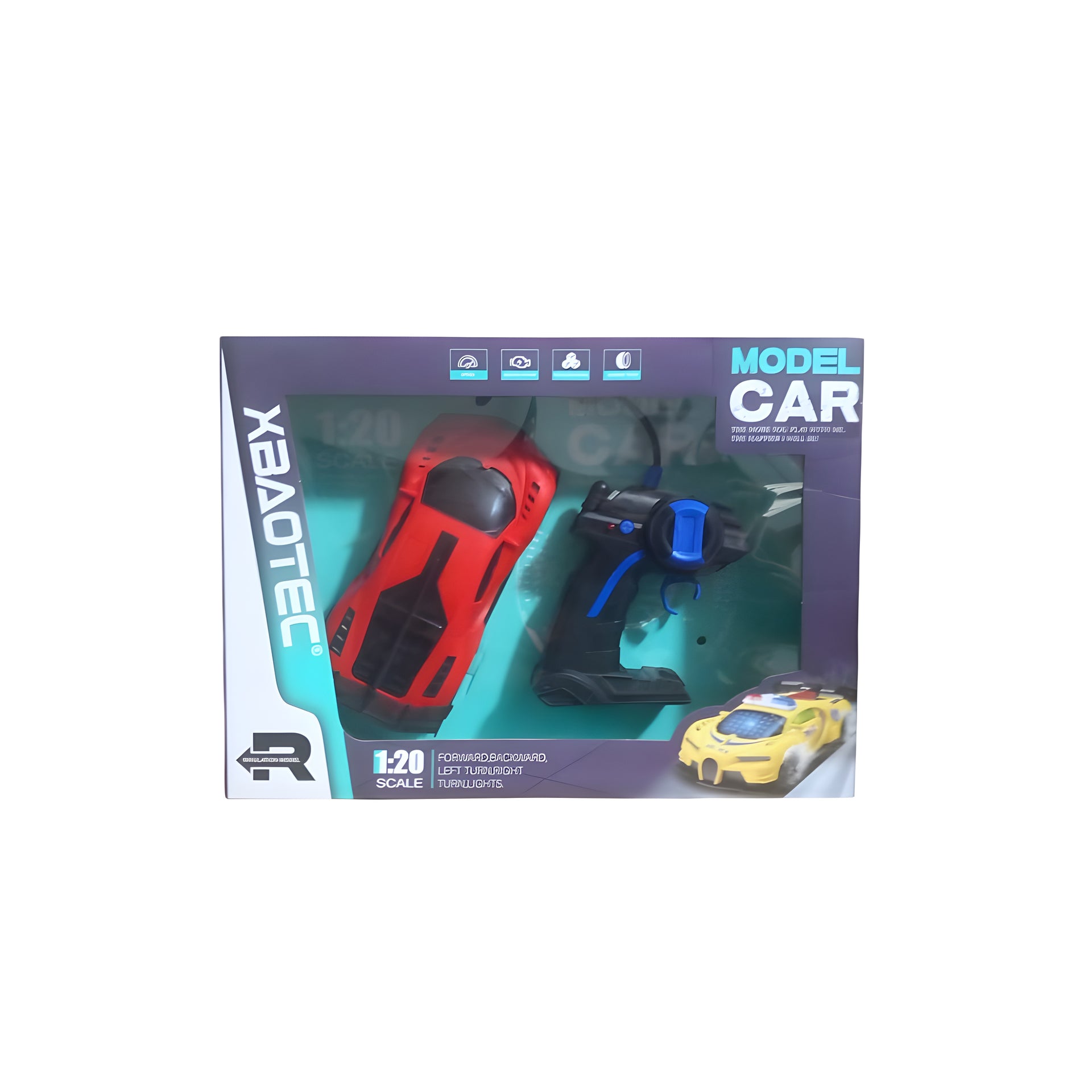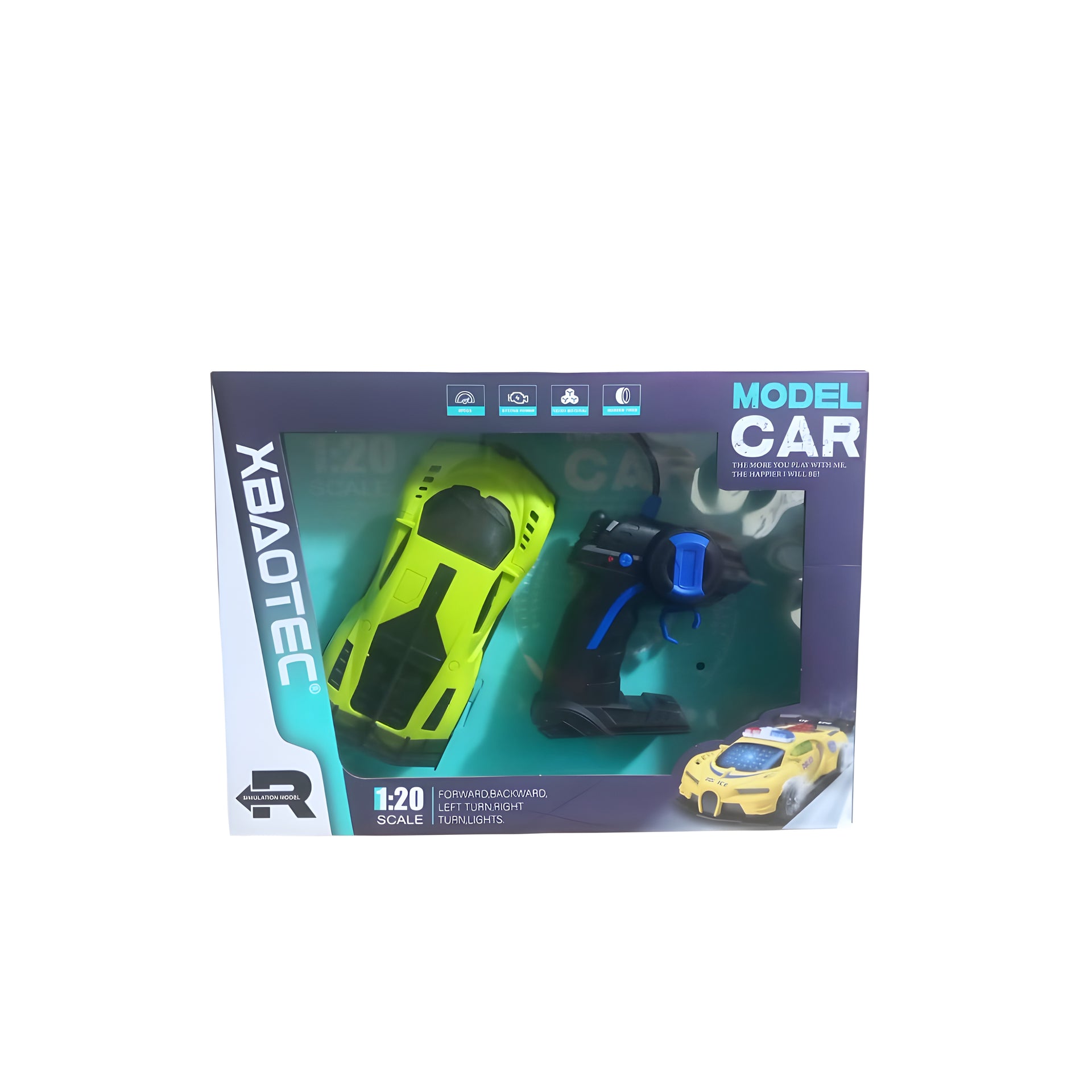 Remote Control Sports Car Scale: 1:20 Controller: Ergonomic remote control with directional joystick (Black & Blue) Motion Functions: Forward Backward Left Turn Right Turn Additional Features: LED Turn Lights High-speed simulation design Realistic detailing on the car body Packaging Highlights: Transparent window box Suitable for display or gifting Recommended for Ages 3+ Power Source: Battery operated (batteries not included – typically AA or AAA for controller and car) Ideal For: Kids aged 3 and above Birthday gifts, casual play, or collector’s toy Benefits: Encourages hand-eye coordination Promotes active play Fun indoor/outdoor racing activity