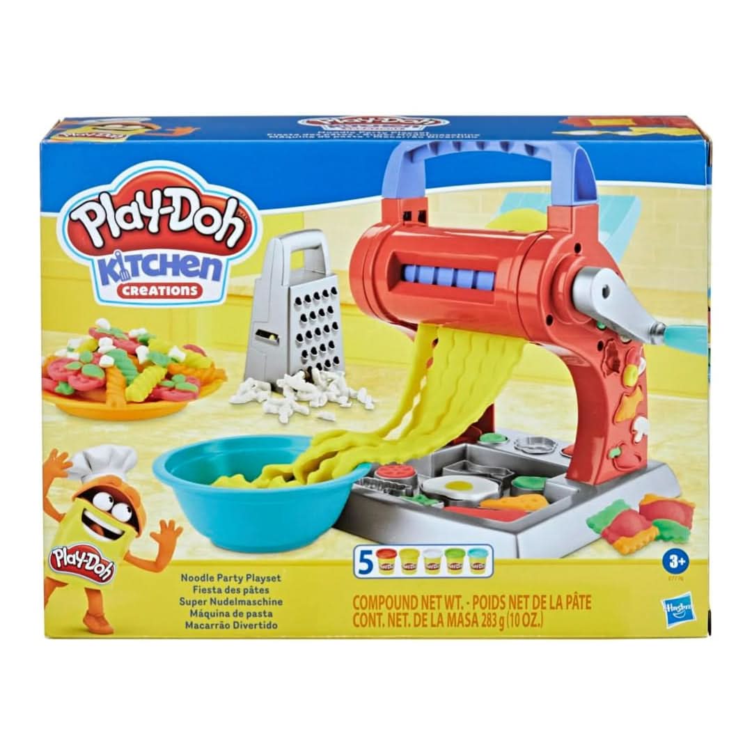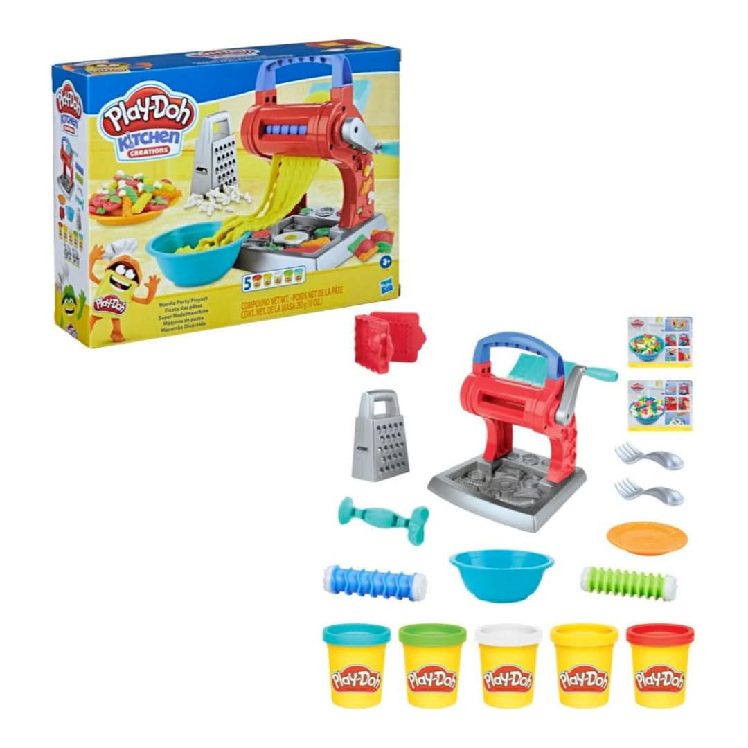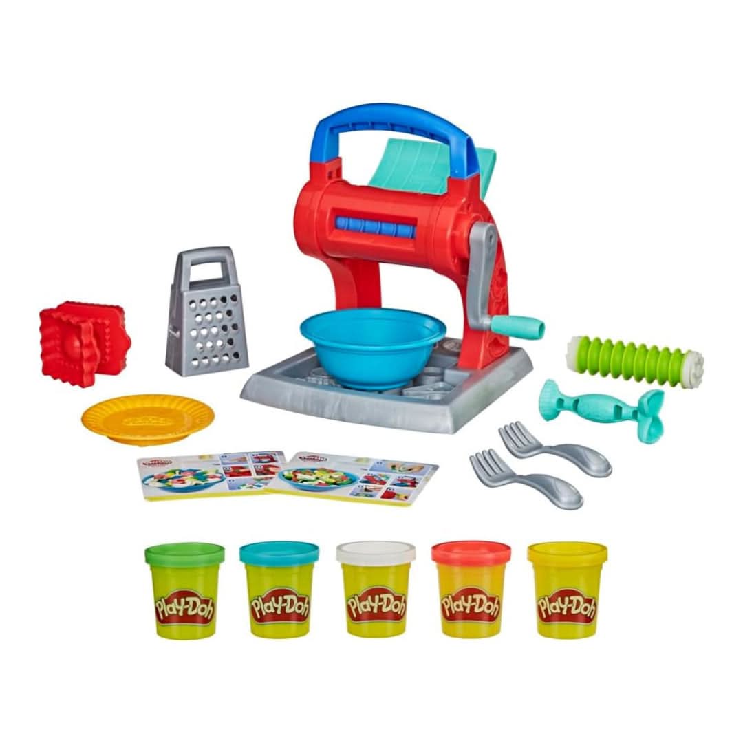 Easy and fun toy noodle maker: Switch between the 2 rollers to make 2 different shapes of noodles from this Play-Doh pasta maker toy for kids ages 3 and up, Everything a Play-Doh pasta chef needs: This Play-Doh food set comes with kitchen accessories like an authentic-looking cheese grater, bowl, plate, fork, and fluffy Play-Doh compound.