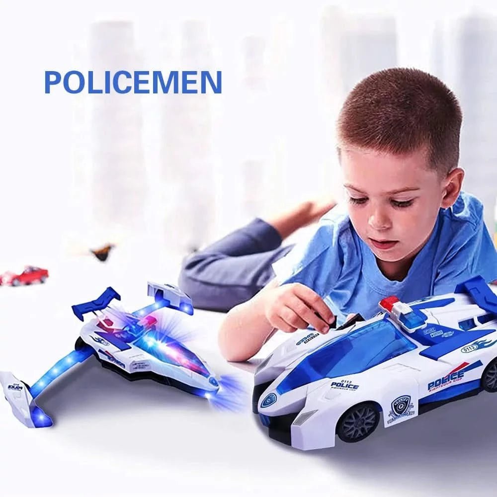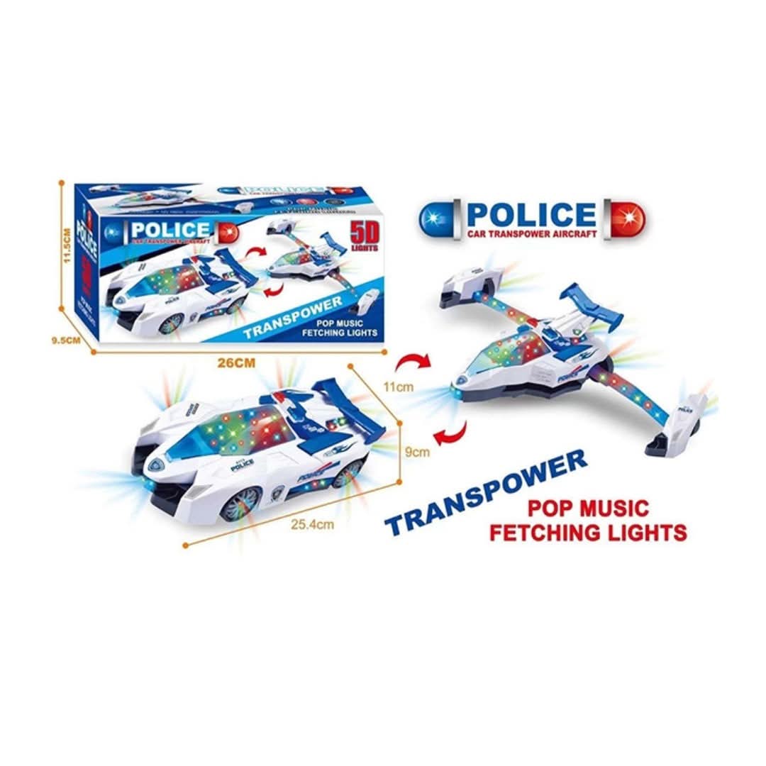 Realistic Police Car Transformed Airplane Toy. Turn on the switch, the car will automatically transfer. The police patrol car and the aircraft can be switched during the transfer process fluently. It's so cool to patrol the streets with a flying police vehicle. The police car toy comes with a universal wheel at the bottom. When encountering obstacles, the toy car will randomly change the driving direction to avoid being stuck. Don't worry about hitting the wall while kids playing. 5D LED Light & Sound Effect Accompanied by gorgeous LED light and dynamic music, the plane car will cry out for justice like the police. Suitable for role playing 3 x AA batteries Not included in the package. Age 3+ year