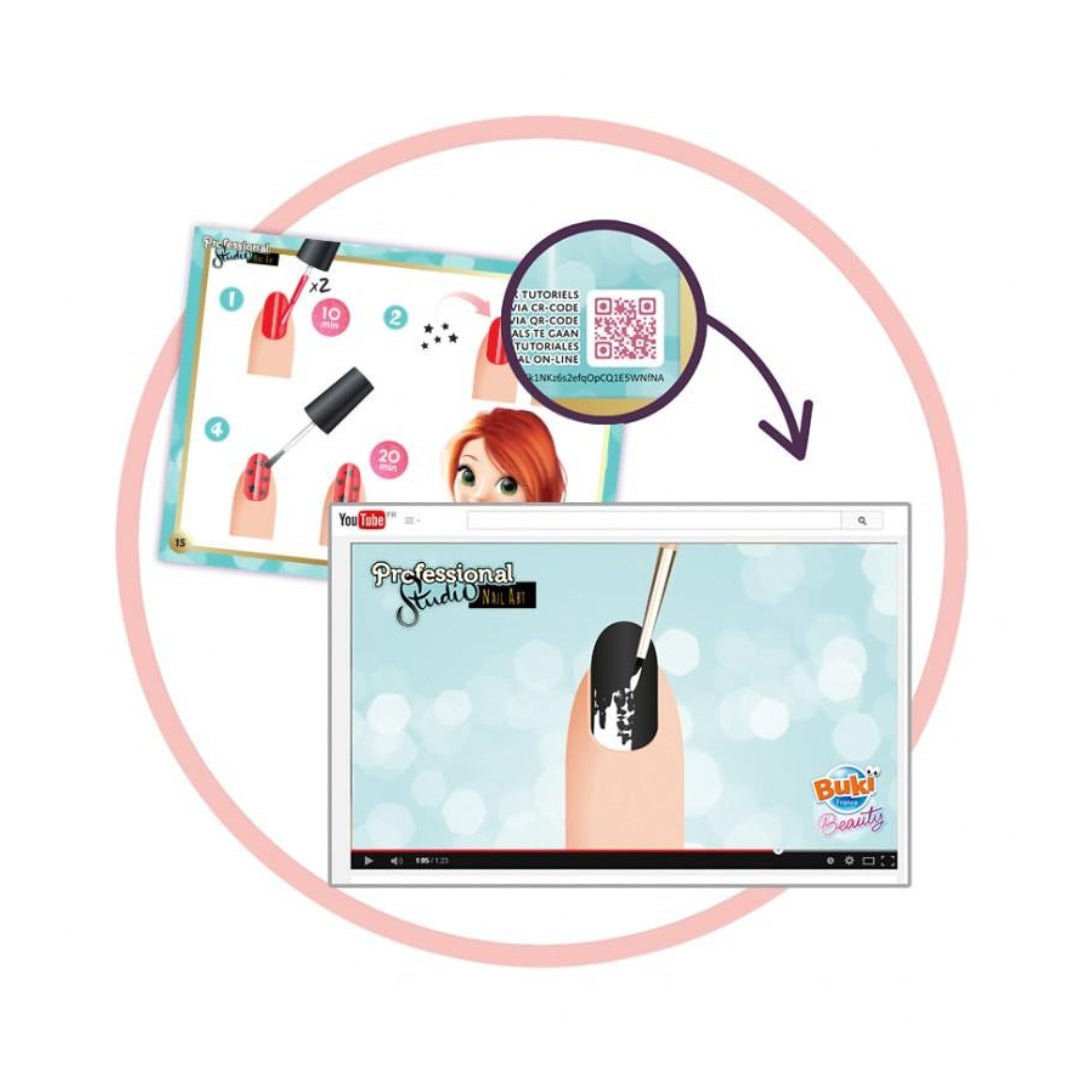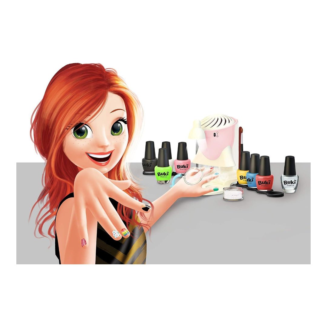 A nail bar with a section for holding the finger you're working on a section for drying your nails more quickly and a magnifying glass and light for precision work. Set includes: 8 nail varnishes, stickers, dotting tool, tweezers, cuticle shaper, nail files.