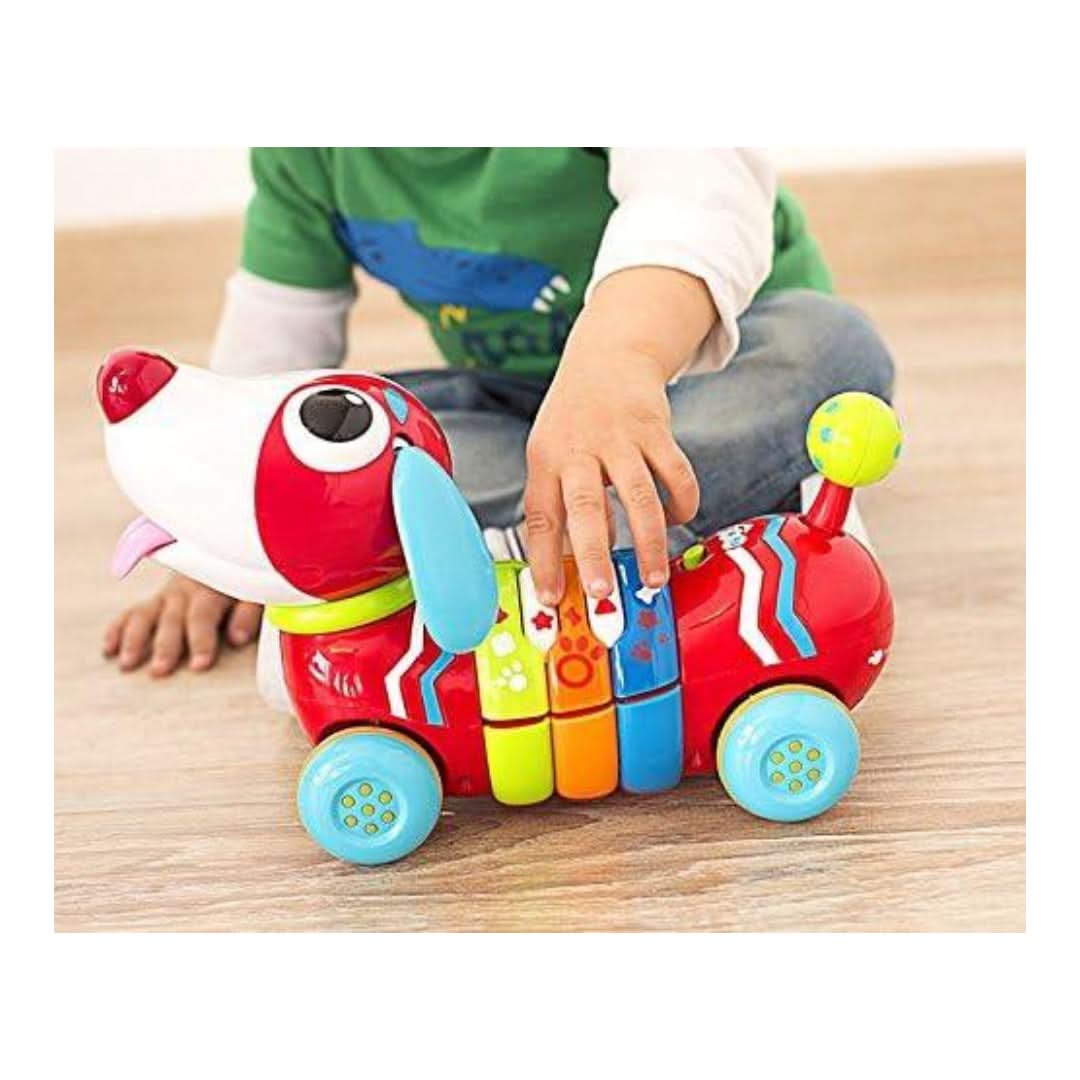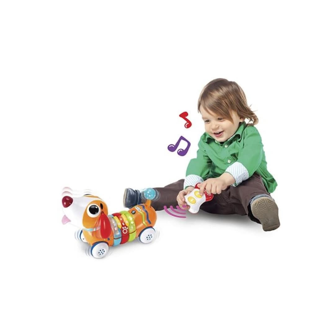 As the puppy walks, it turns its head, wiggles its tail and swings its ears"