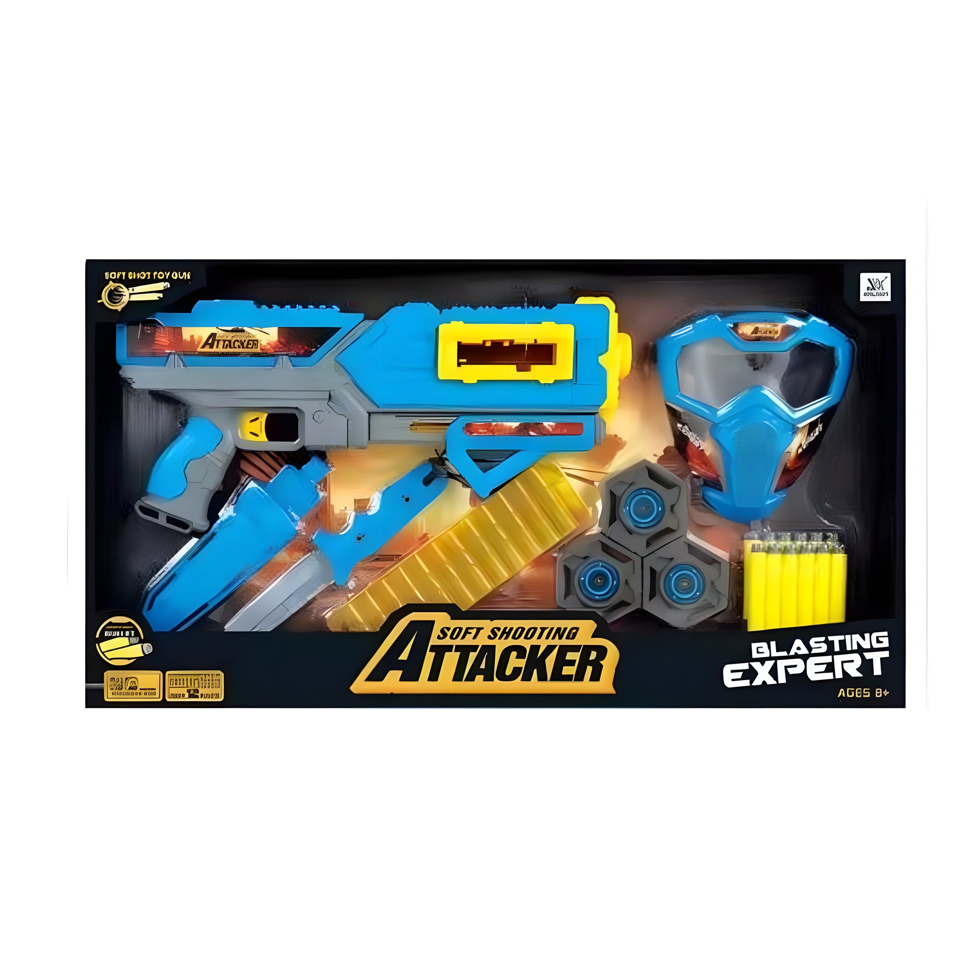 Soft Shooting Attacker Blasting Expert Series Product Dimensions (Box): 65 cm (L) × 35 cm (H) × 6.5 cm (W) Gun Size: 41 cm (L) × 21 cm (H) × 5.9 cm (W) Recommended Age: 6 years and above Included in the Box: 1x Soft Bullet Gun (manual spring-powered blaster) 12x Soft Foam Bullets (safe for indoor/outdoor play) 3x Target Discs 1x Tactical Chest Strap 1x Toy Knife Features: Manual operation no batteries required Safe soft foam bullets, designed for children Realistic tactical design for imaginative play Lightweight and easy to handle Ideal for target practice and role-playing games Material: Made from durable, non-toxic plastic Safety Notice: Not suitable for children under 3 years Do not aim at eyes or face Perfect For: Indoor/outdoor play Team games or solo practice Gift for birthdays or holidays