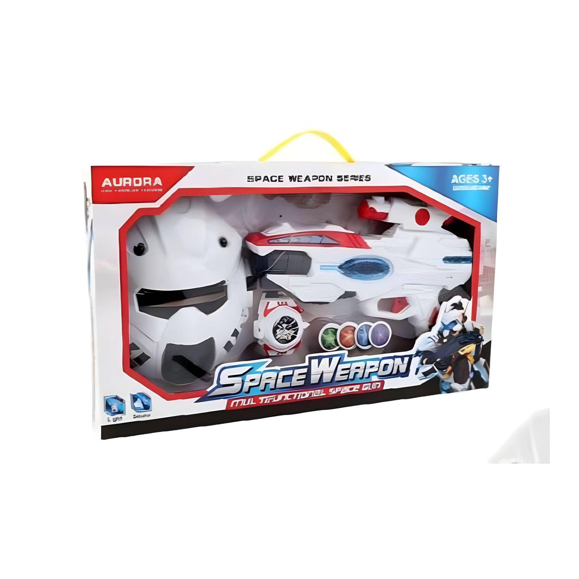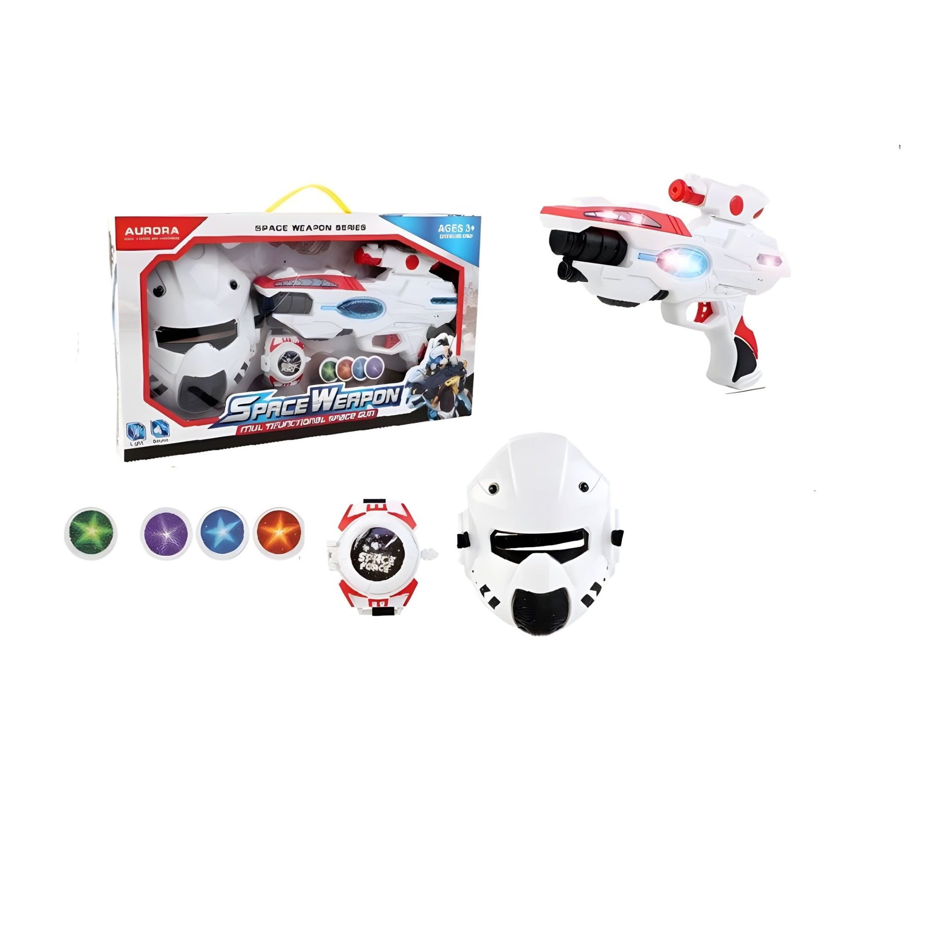 space weapon set, which is the perfect prop for fighting a dangerous enemy from a distant planet. This unusual, original weapon has space sounds and lights , which will certainly encourage all children to play. The space weapon set includes : - mask, - gun, watch, The space weapon consists of a gun and a mask. The colors of these defense means consist of light, subdued colors, combined with intense red and coral shade. The mask included in the set is designed in white and gray colors, has a rectangular hole for the eyes, holes around the mouth and an elastic band attached to the back, which will make the mask stay in the right place during play. After pressing the trigger, the gun lights up and makes sounds, so it is worth trying the toy in a dark room. The weapon is powered by 3 x 1.5 V AA batteries, which are not included in the set. All elements of the space set are made of high-quality material.