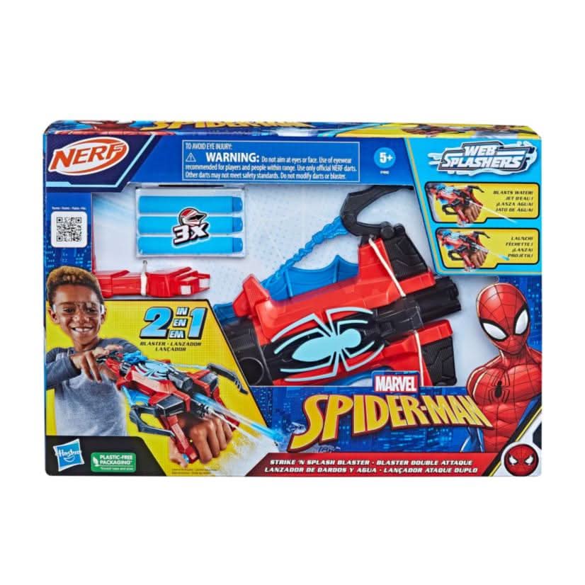 Two different worlds collide in this Strike N Splash Blaster! Nerf and Spider-Man come together all in one epic web-launching, water blasting toy. Blast your opponents with nerf darts and activate the toy’s water blasting feature at the push of a button. Kids will love pretending they are the classic Marvel web-slinging super hero with a twist. This Spider-Man Strike N Splash Nerf Blaster makes the perfect gift for Marvel and Nerf fans ages 5 and up!