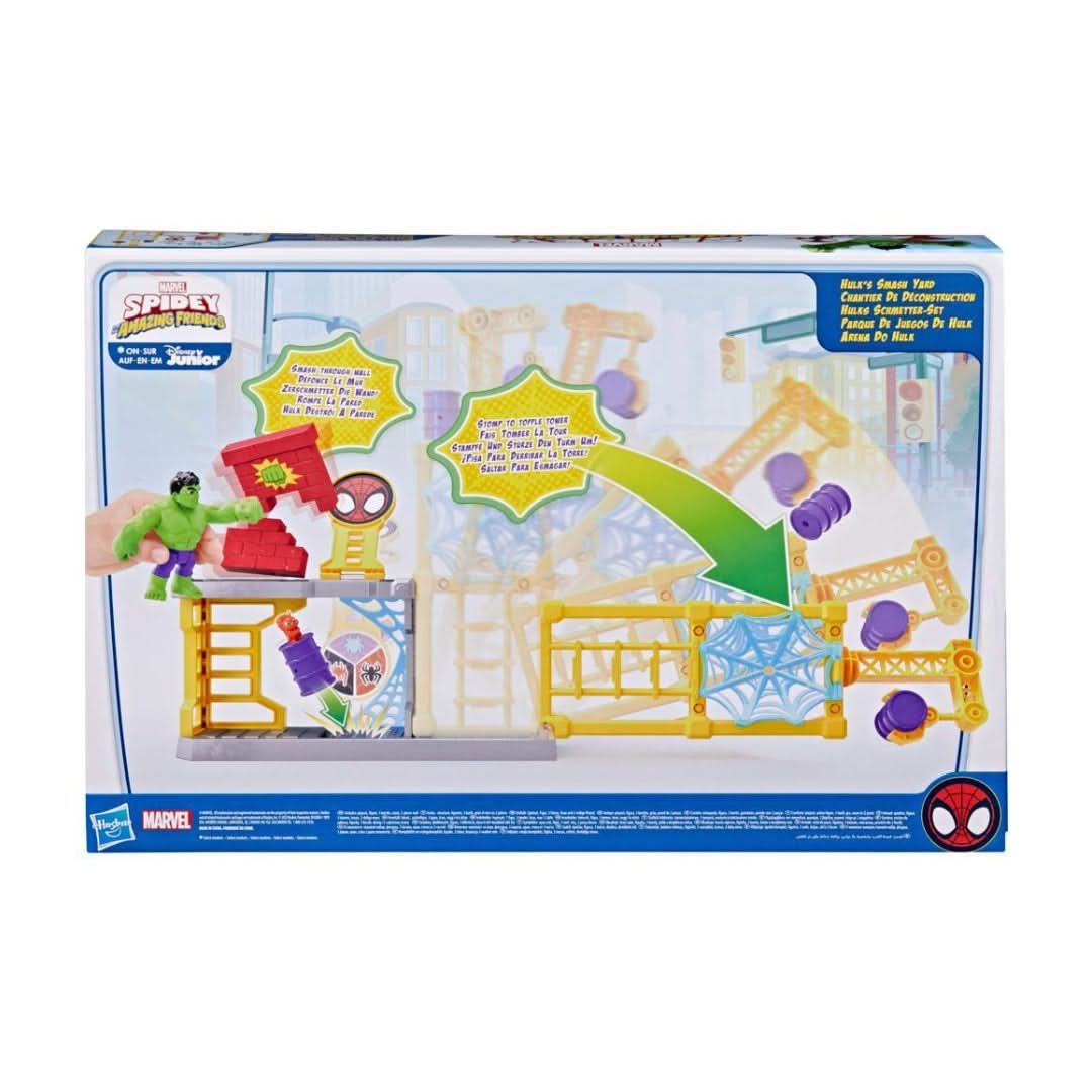 Inspired by the Marvel preschool animated television series "Spidey and his amazing friends"", the Hulk's Smash Yard playset is ready to keep you having fun splitting and destroying! This multi-storey Hulk playset contains a collapsing tower, a wall to be destroyed, a spider web-trap, a spinning Spidey sign, a mobile crane, barrels and a Hulk action figure. Boys and girls can collapse the tower by walking the Hulk action figure on the lowest floor stepping on their feet. So you don't stop playing, just bring the tower back to its original state. When the Hulk action figure breaks down the brick wall, it breaks in two! A mobile crane, which must be operated by the child, can hold one of the 3 barrels included, or the barrels can be stacked and then knocked down as the Hulk tries to catch a sneaky squirrel. This Hulk toy for boys and girls aged 3 and up makes a super fun party or birthday gift.