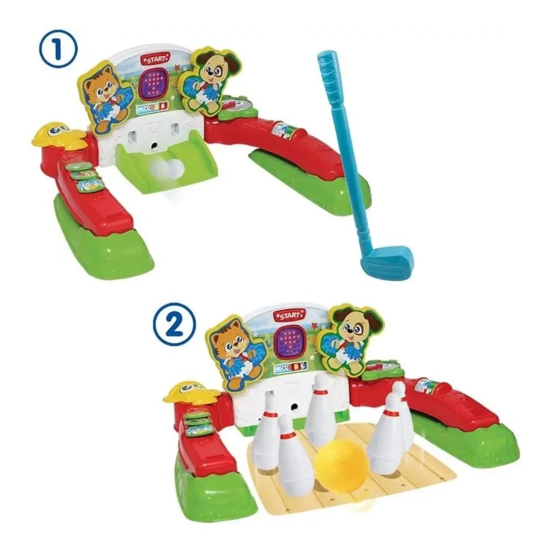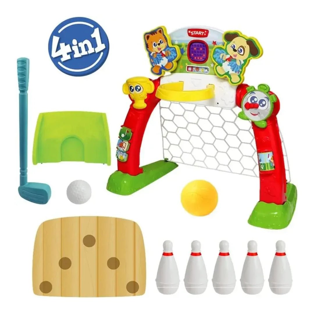 What is this play centre has it all! What do I want to play for today? Basketball, football, golf and bowlings are the sports you can practice with this complete 4-in-1 sports centre. Package includes 5 bowls, 1 golf club and 1 ball. It has an LED marker that shows the results and fun animations depending on the sport you choose. On the side supports there is a roll with pictures and a fli-flap with animals. What do you learn to learn? This toy promotes global motor skills, imagination, creativity, dexterity, spatial orientation, socialization, understanding and hand-eye coordination. What you should know...Use is recommended from 18 months. Works with 3 AA batteries (included) - sport and fun with WinFun!