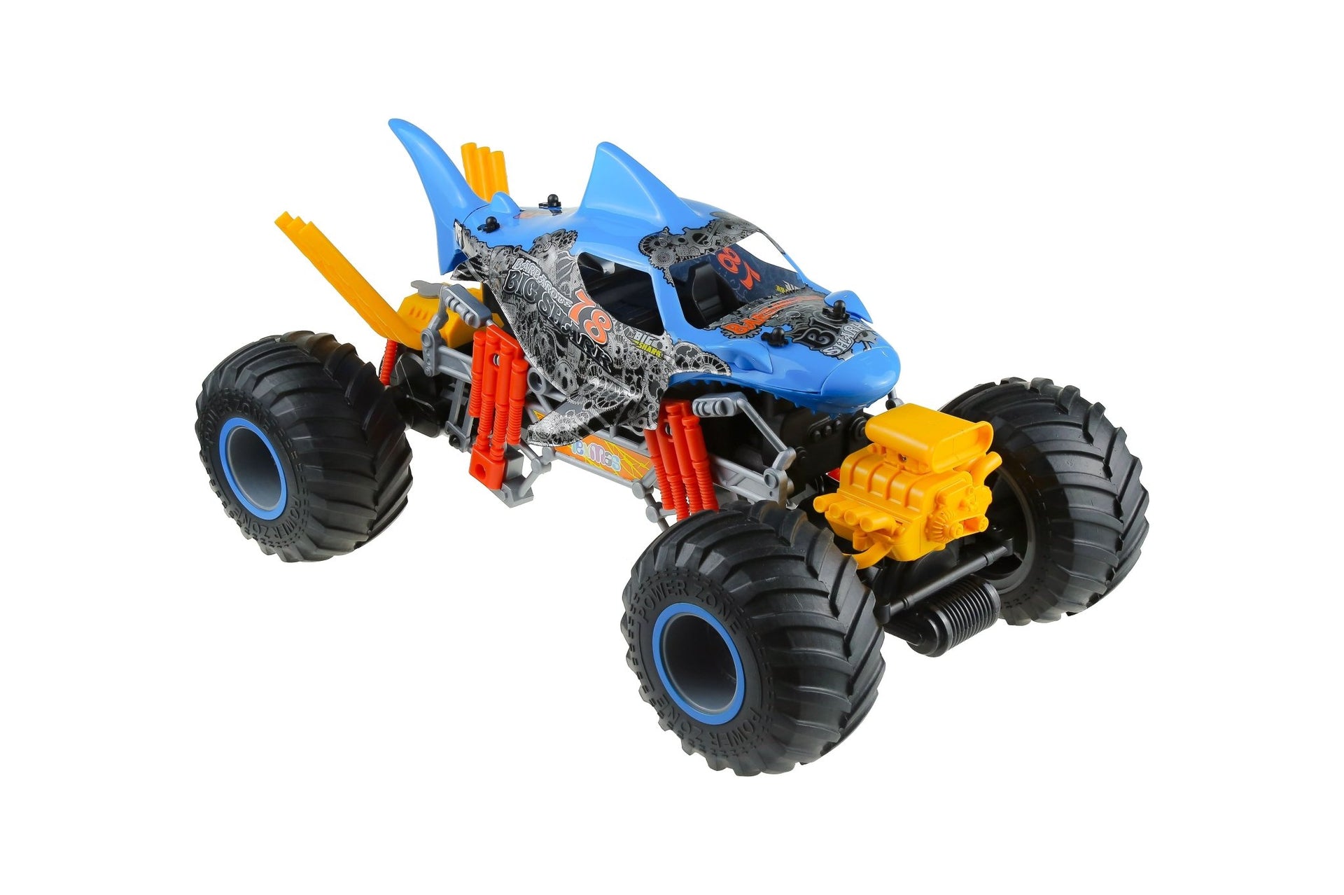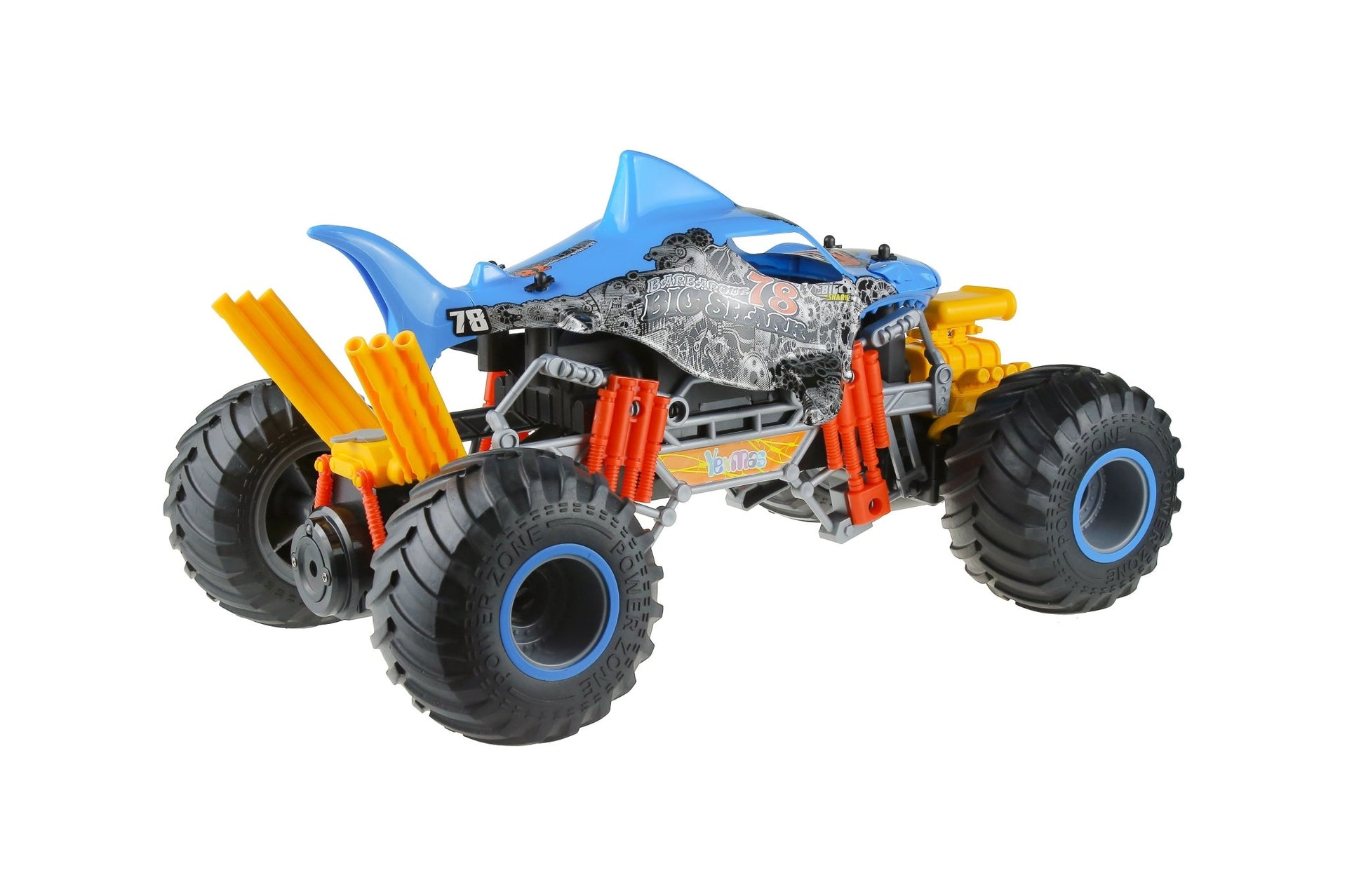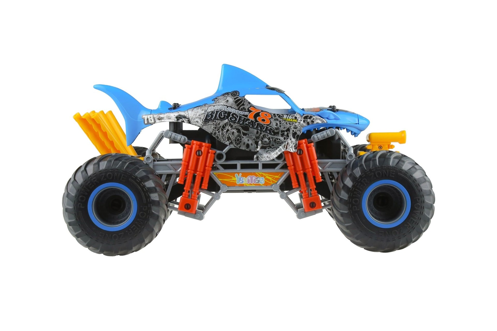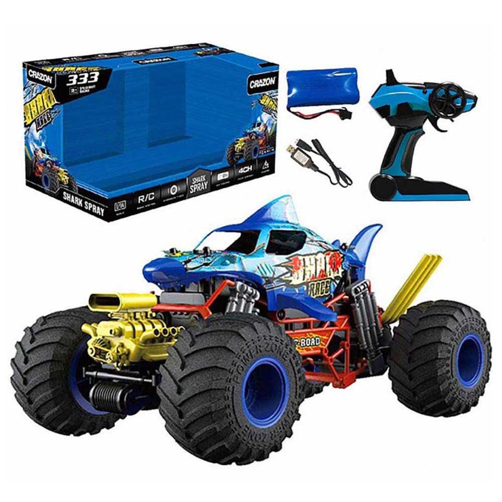 Monster truck shaped like a shark and a very aggressive engine. It is a 1:10 scale car with different functions, blowing smoke or simulating engine vibration. It also includes a rechargeable lithium battery and has an autonomy of about 25 minutes. Reaches a maximum speed of 15km/H. Not recommended for children under 3 years old. Package Size: 53 x 26 27.5cm.