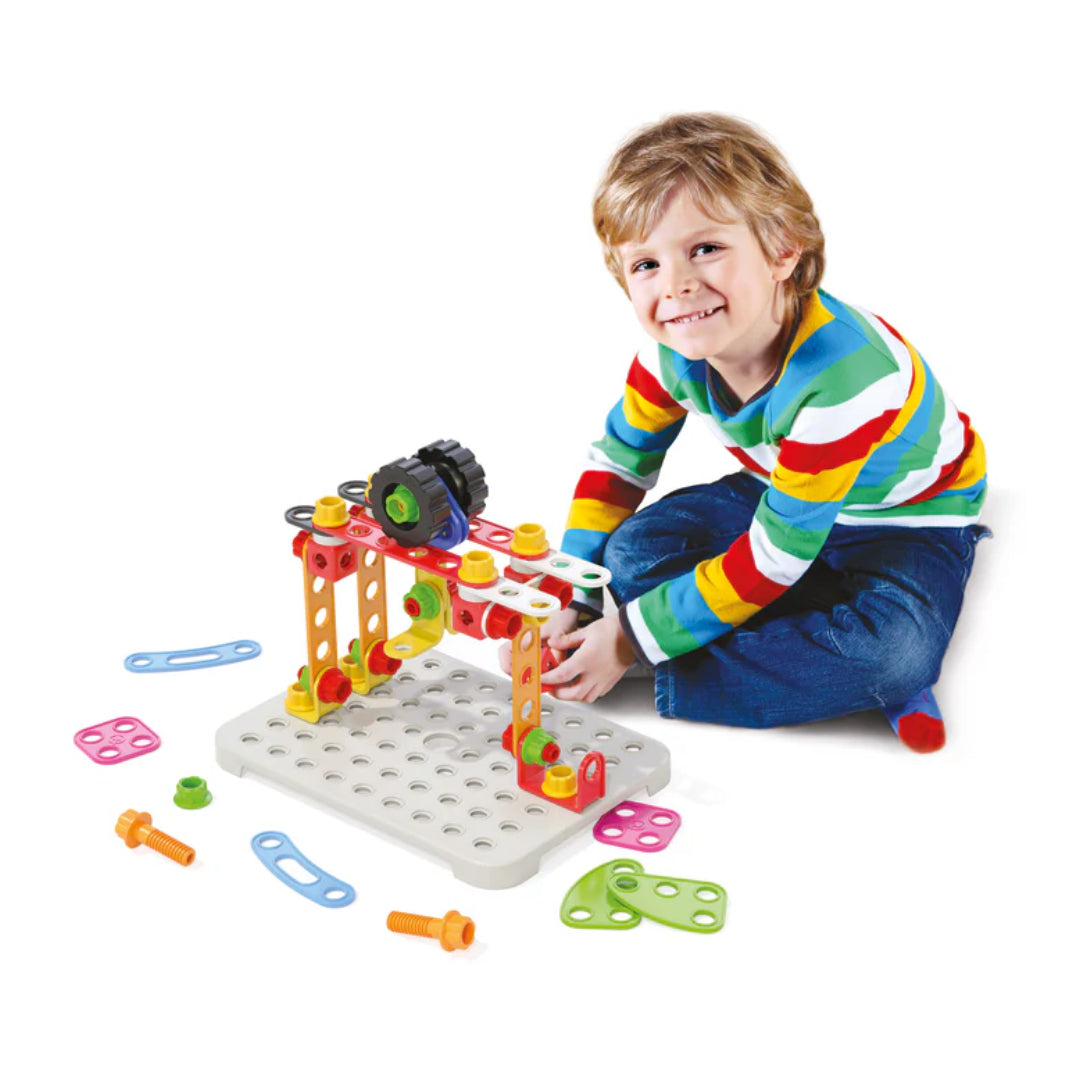 Tecno Jumbo Toolbox has everything a child needs to build a world of trucks, excavators, cranes or anything else that comes to mind. Screws, bolts, wingnuts, wheels and perforated plates, made of resistant shatterproof plastic, can be assembled without special tools. All a child needs is a pair of hands and a lot of imagination. When playtime is over, everything fits back into the handy tool box. The box has a handle and a cover that can be used as a base for playing on. This building toy stimulates coordination as well as logic and creativity, helping children to understand basic principles of mechanics while enjoying themselves.