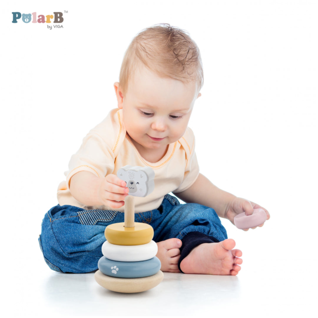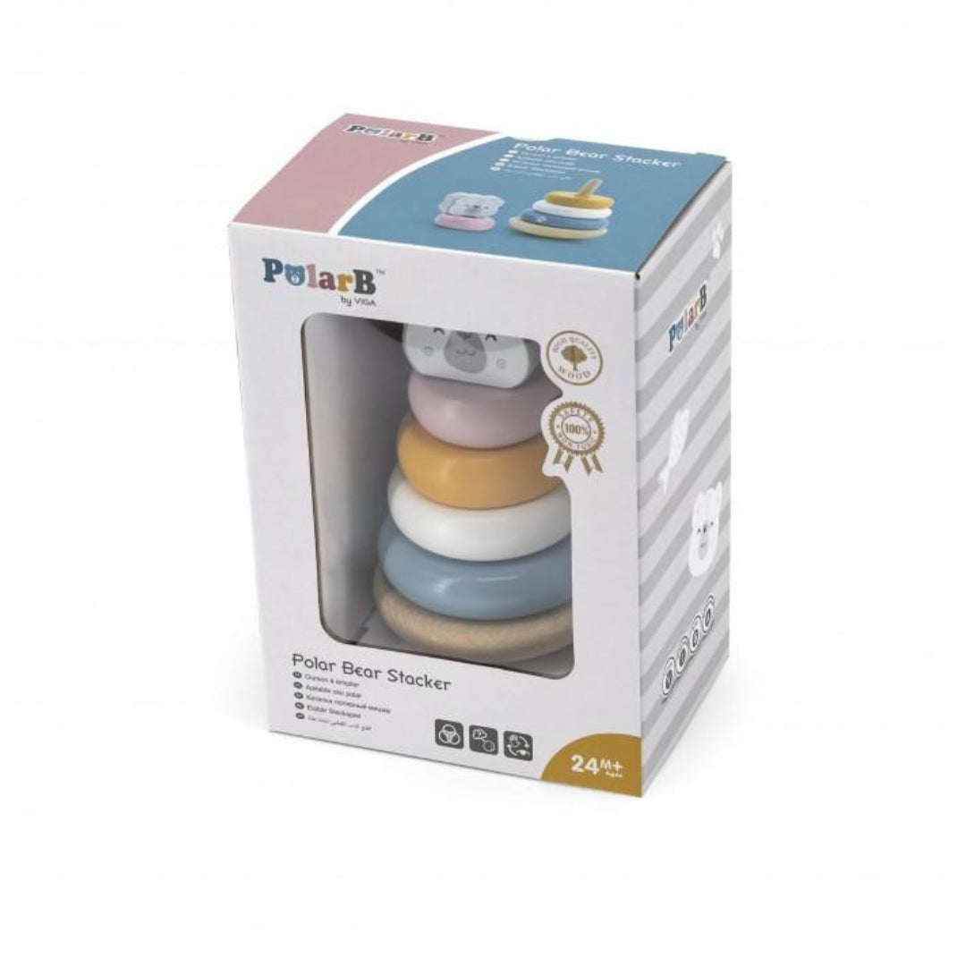 The Polar Bear Stacker is a wooden stacking toy designed to engage toddlers in educational play. This toy features a friendly polar bear face and includes four pastel-colored rings that can be stacked in various orders. The rings are adorned with playful paw prints, adding to its charm. The base has a rocking feature, adding an element of fun as it gently wobbles when pushed.